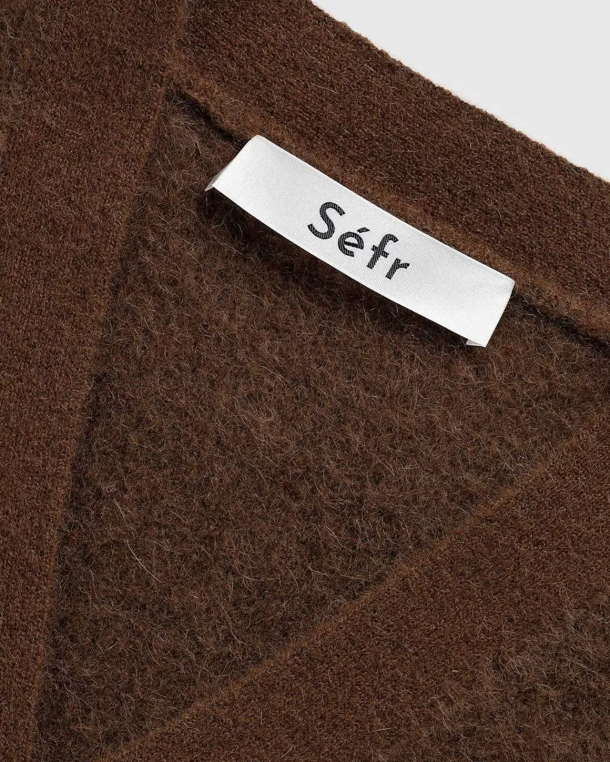 Kaitoen Er En Afslappet Sweaterstil Af Séfr, En Der Kommer Denne Sæson I En Neutral Brun Farvevariant. Beklædningen Er Lavet Af Et Blødt Mohair-Blandingsstof Og Har Traditionelle Designelementer I En V-Udskæring, Knaplukning Foran Og Ribkanter. To Lommer Er Indbygget På Forsiden Af Silhuetten For At Fuldende Designet.
