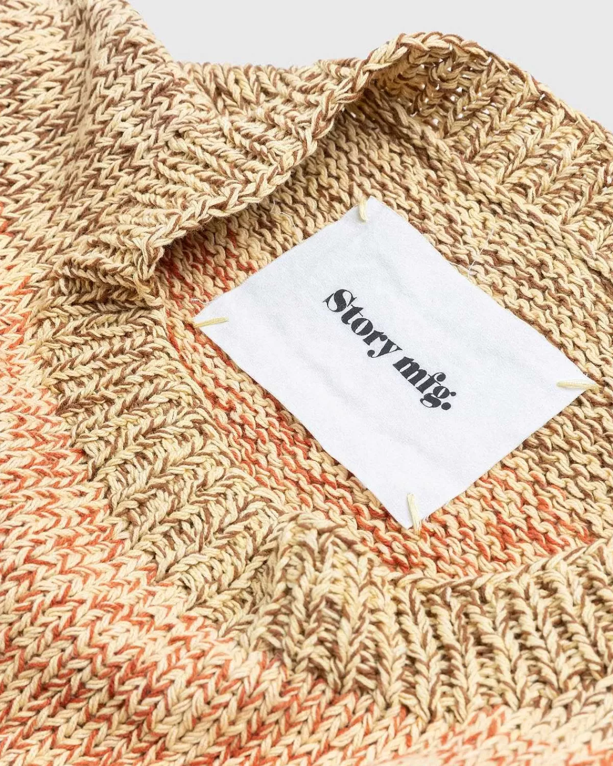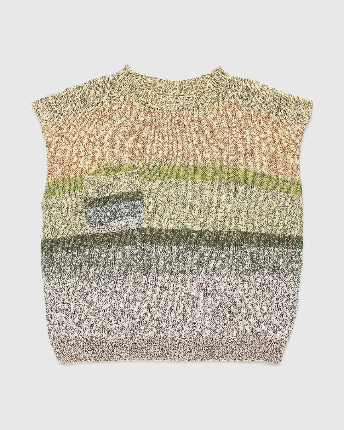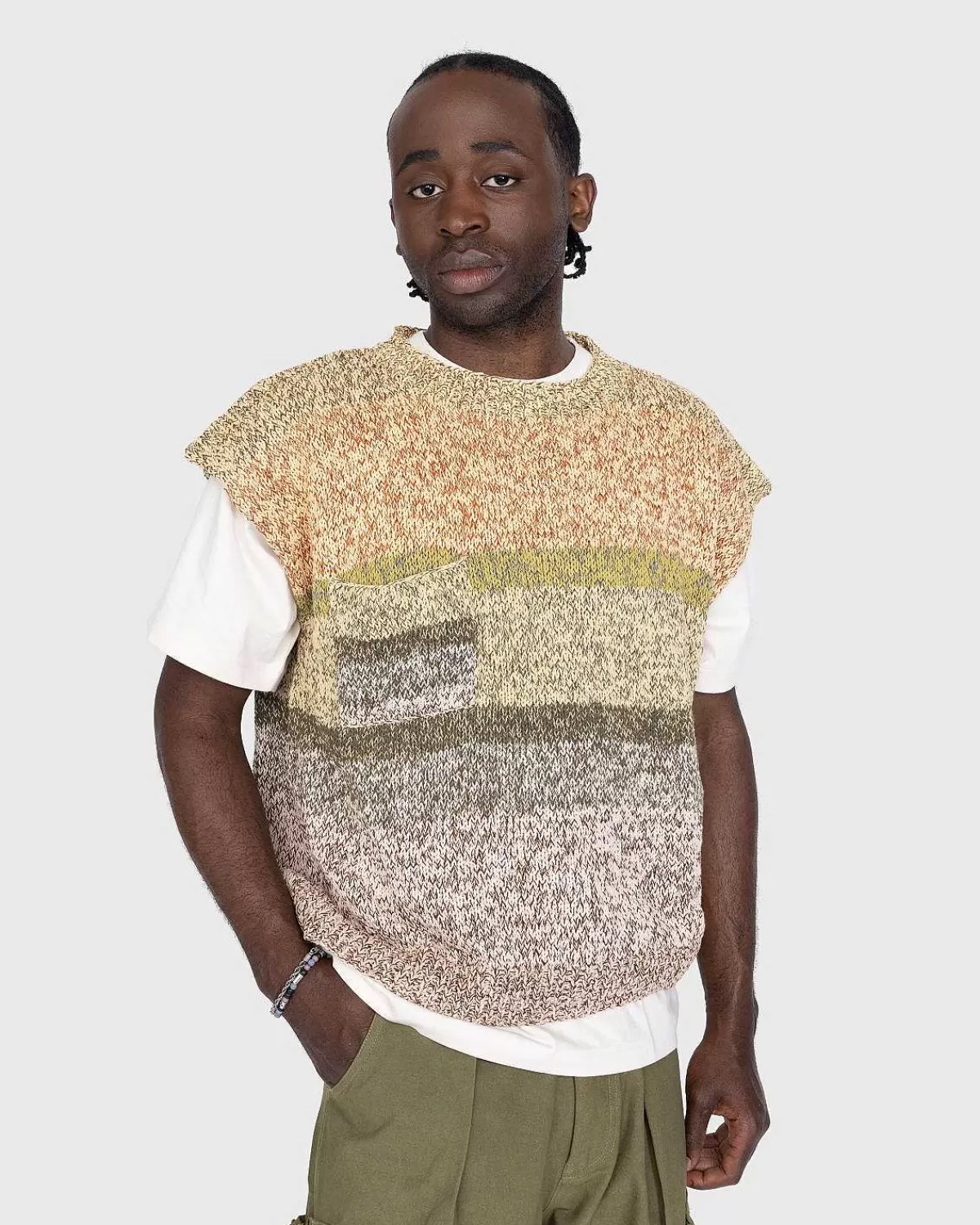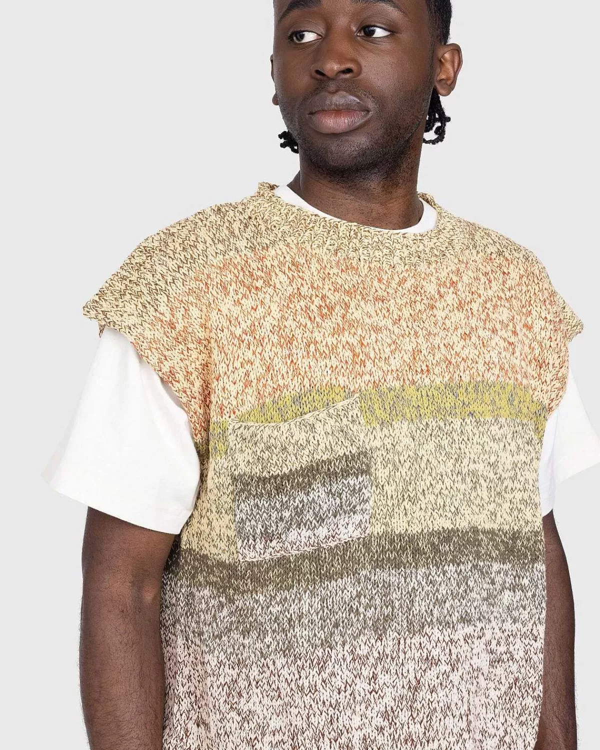 En Af De Fremtrædende Fra Story Mfg.’S Seneste Sæsonkollektion Ankommer Ved Hjælp Af Holdevesten. Den Farverige Sweater Er Helt Håndstrikket Ved Hjælp Af Økologisk Bomuld, Som Er Blevet Naturligt Farvet. Holdevesten Er Lavet Til At Være Løs Og Draperet, Og Den Vil Vokse Med Slid På Grund Af Håndstrikning.