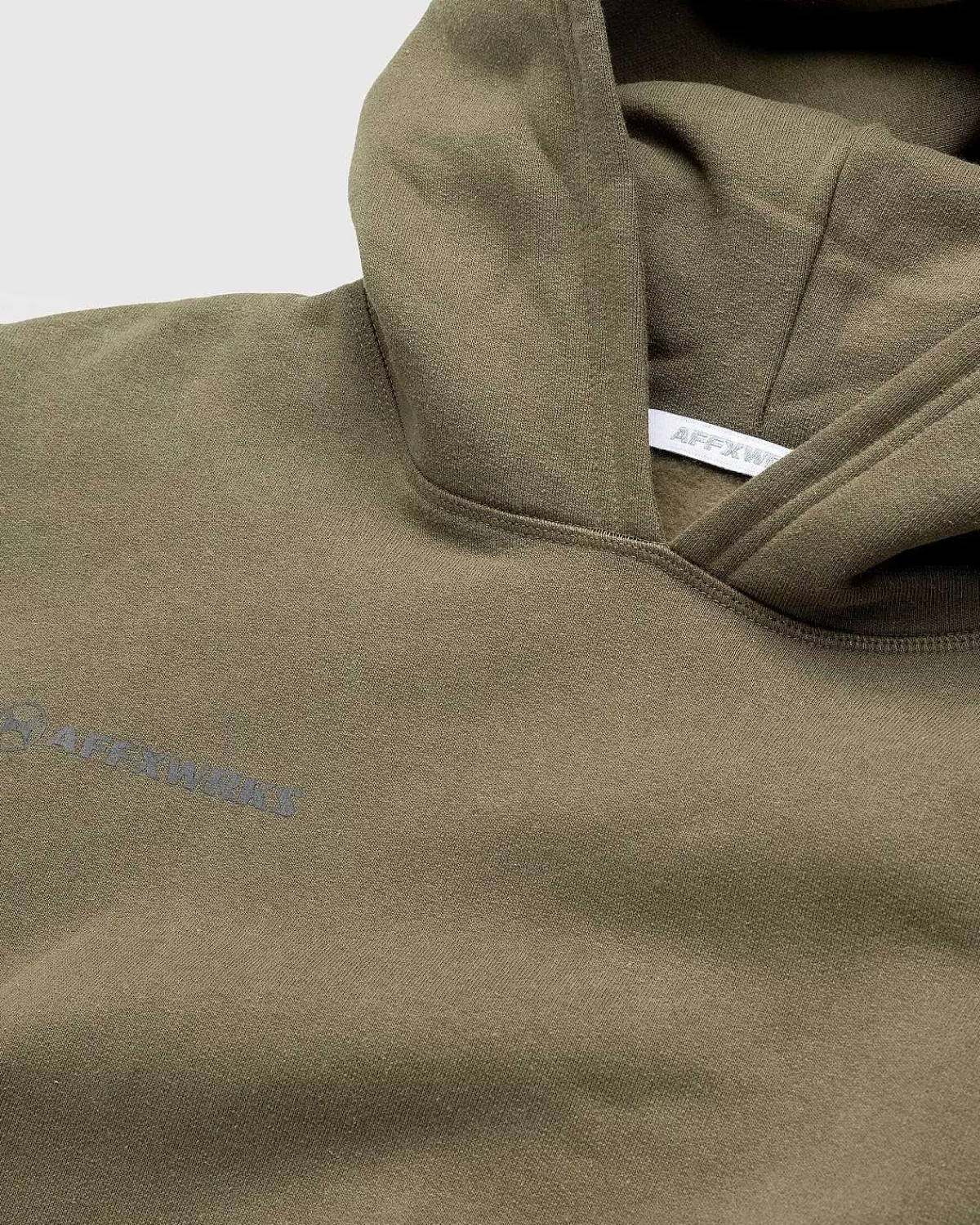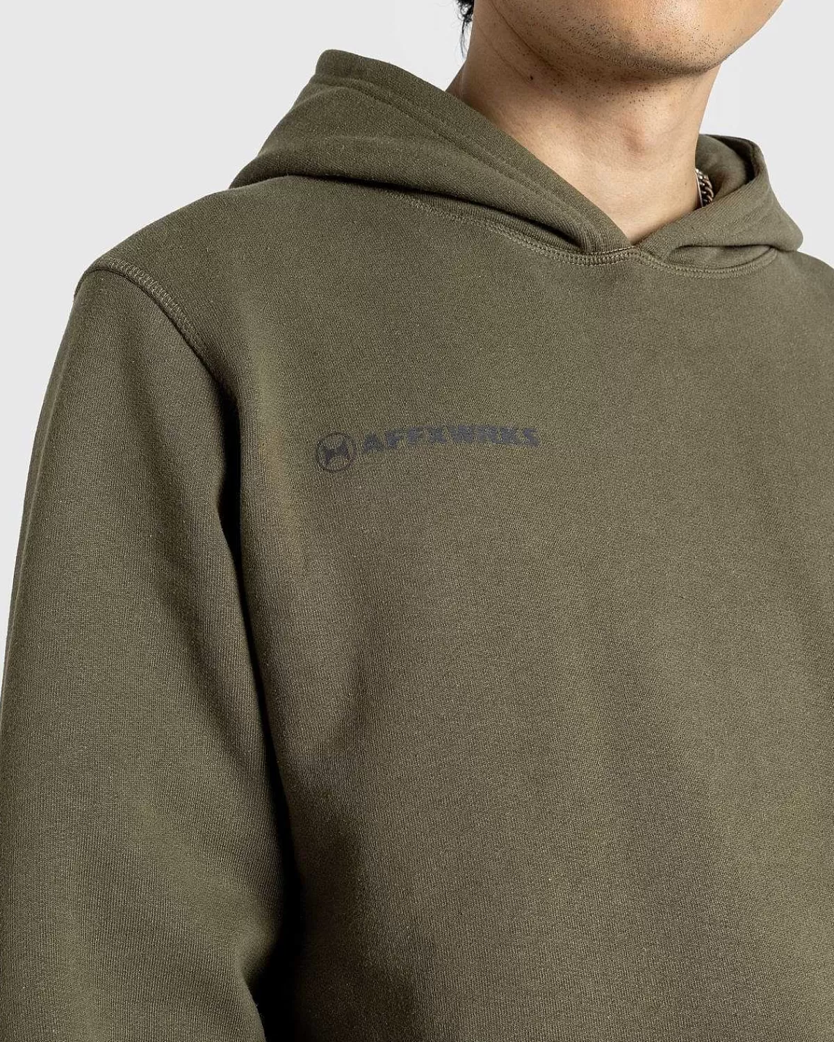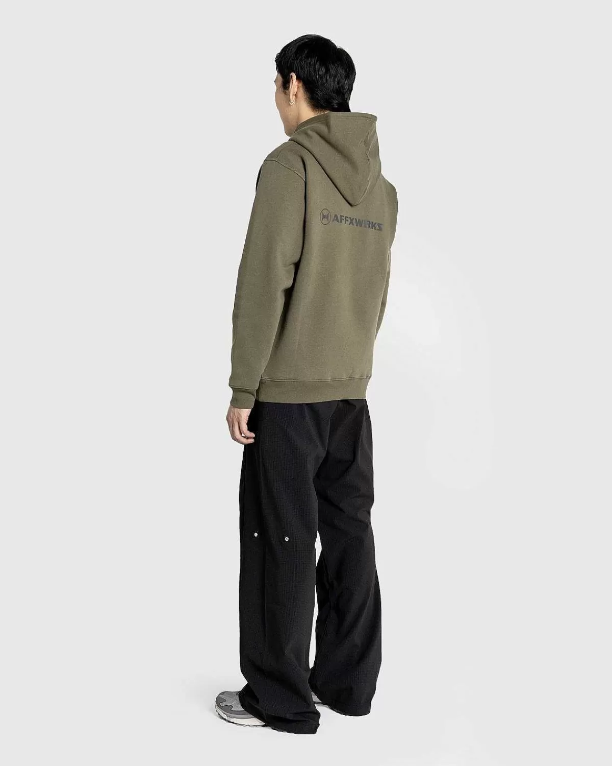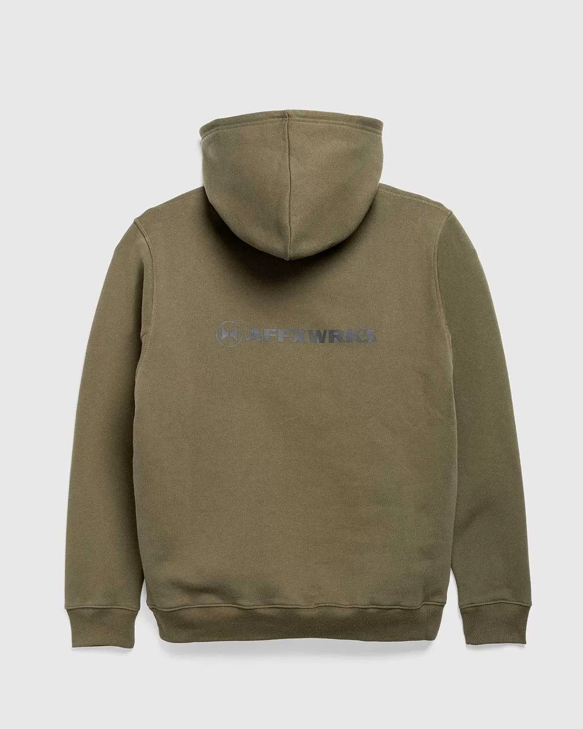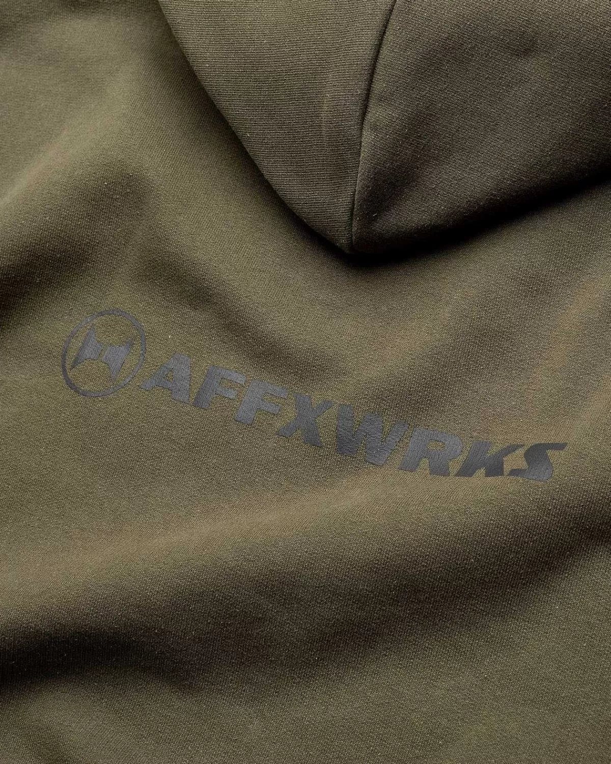 Affxwrks-Hættetrøjen Er En Fast Affix-Stil, Der Ankommer Til Sæsonen I En Indbydende Overskudsgrøn Farve. Den Er Skåret Til En Standardpasform Af Et Mellemvægts-Fleece-Rygjerseymateriale Med Flatlock-Sømme. Traditionelle Hættetrøjedesignelementer Er Implementeret Overalt, Inklusive En Fast Hætte, Frontlomme Og Ribstrikket Kant Ved Manchetterne Og Forneden. Grafiske Print Kommer Derefter Frem På Forsiden Og Bagsiden For At Definere Beklædningen.