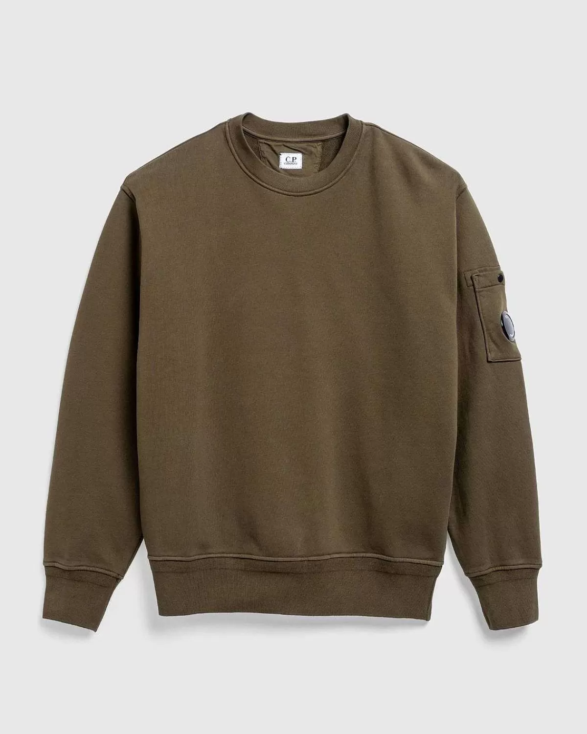 Denne Staple Cp Company-Sweatshirt Er Lavet Med Letvægts Bomuldsfleece For En Fleksibel Pasform Og Beklædningsfarvet For At Øge Kromatisk Dybde Og Intensitet Hele Vejen Igennem. Den Har En Traditionel Rund Hals Og Er Detaljeret Med Ribkanter Ved Halsudskæringen, Manchetterne Og Forneden, Mens Den Viser Mærkets Signaturlinse Anbragt På Venstre Ærmelomme.