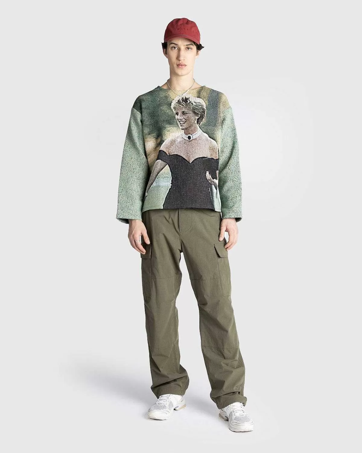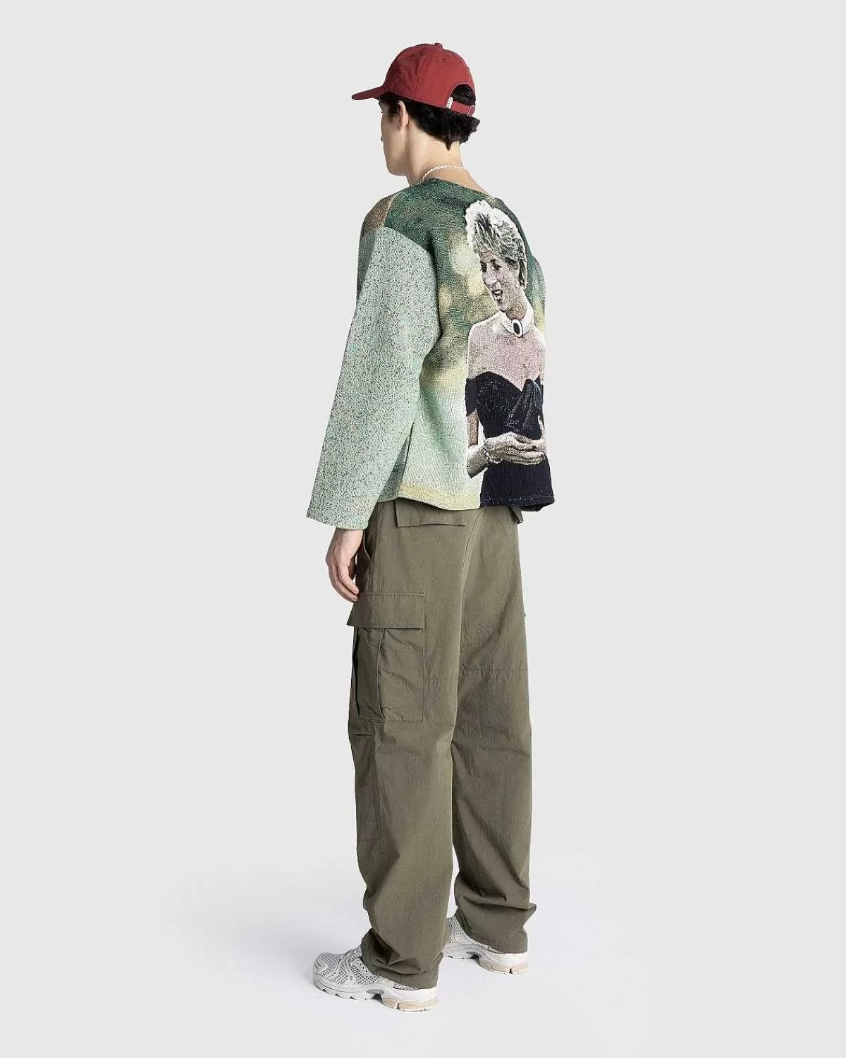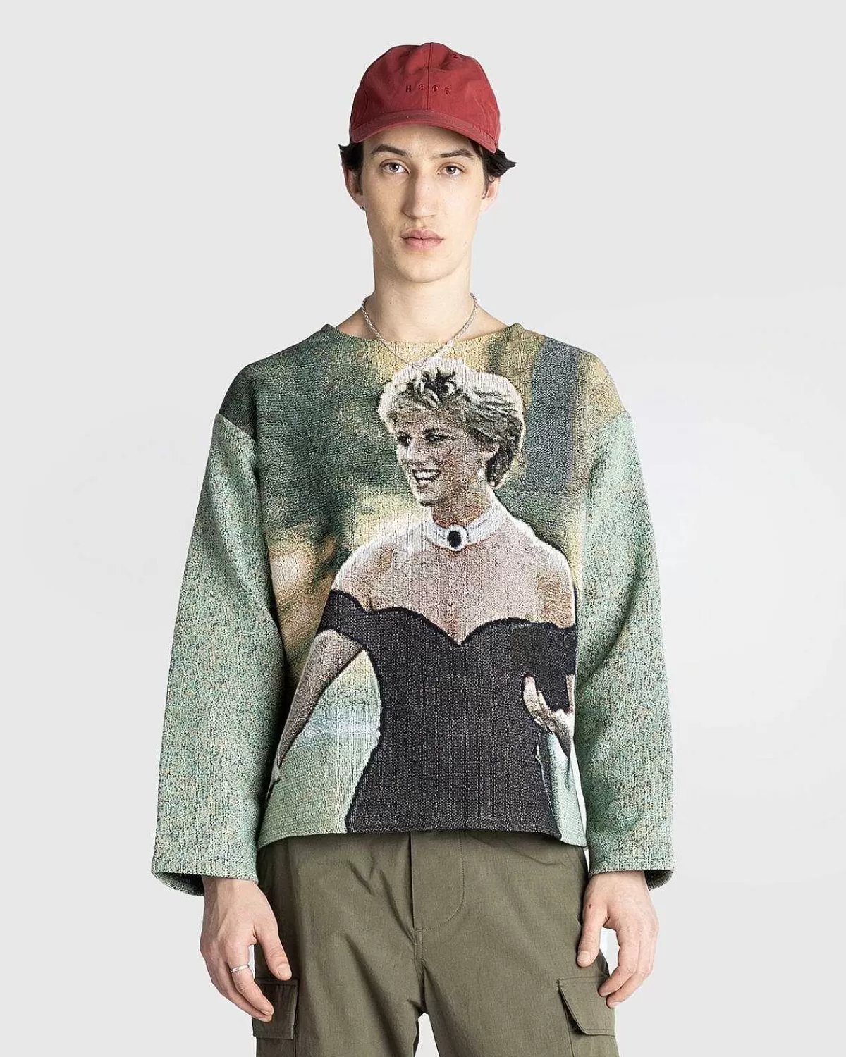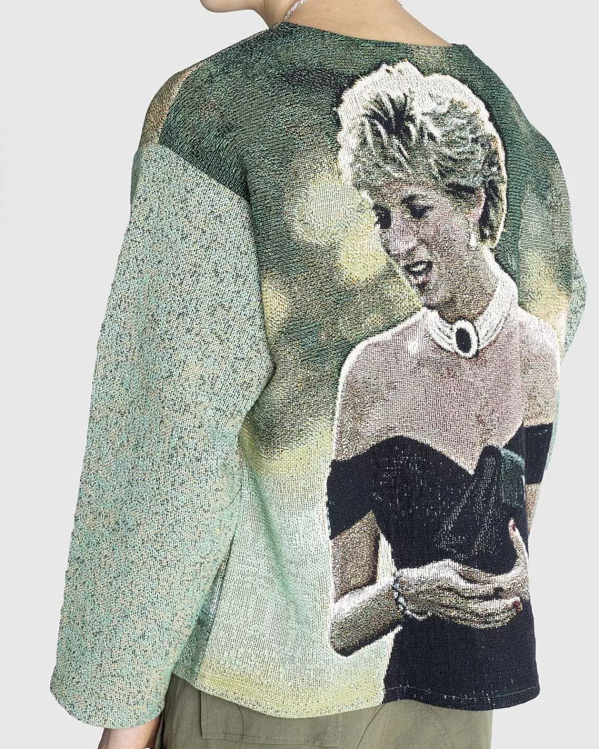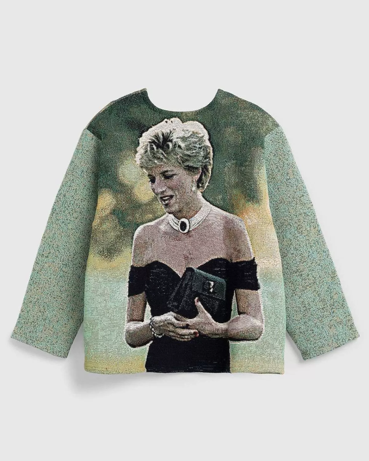 Denne Striktrøje Er Detaljeret Med Et All-Over Print, Der Ligner Den Tidligere Prinsesse Af Wales Iført Sin ‘Hævnkjole’ Til En Middag I Serpentine Gallery. Den Langærmede Top Er Skåret I En Overdimensioneret Pasform Med Faldede Skuldre Og Har Billeder Af Prinsessen Foran Og Bagpå.