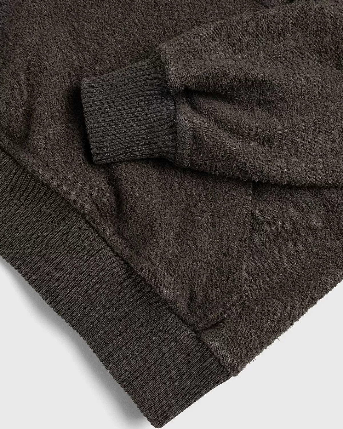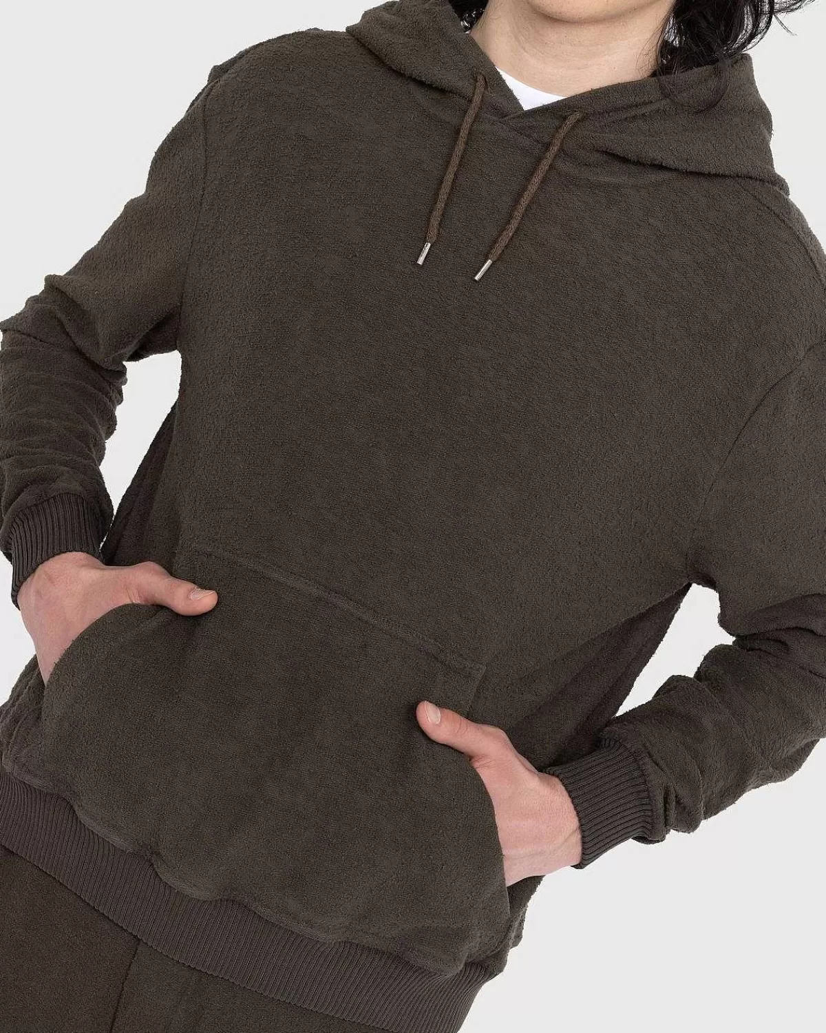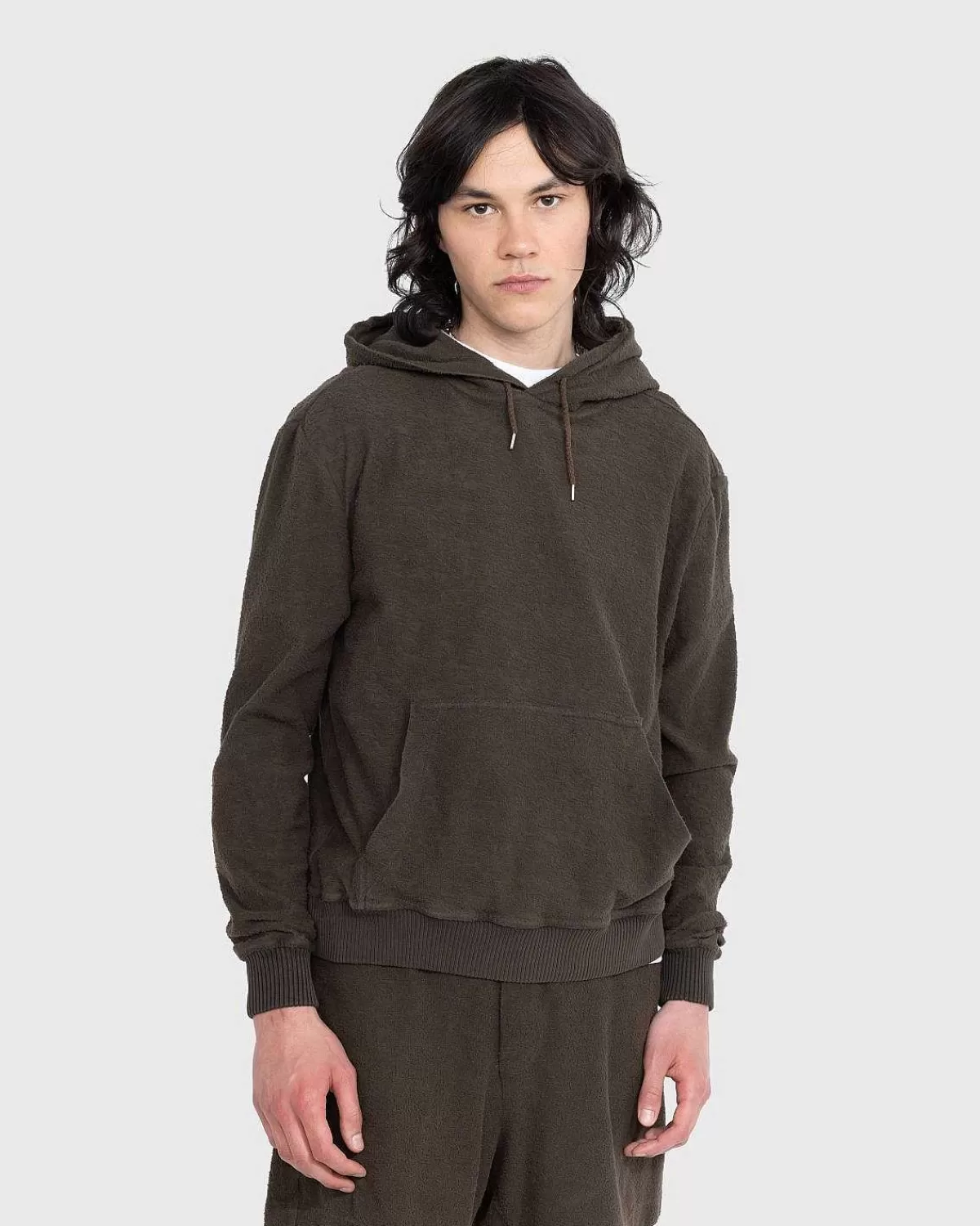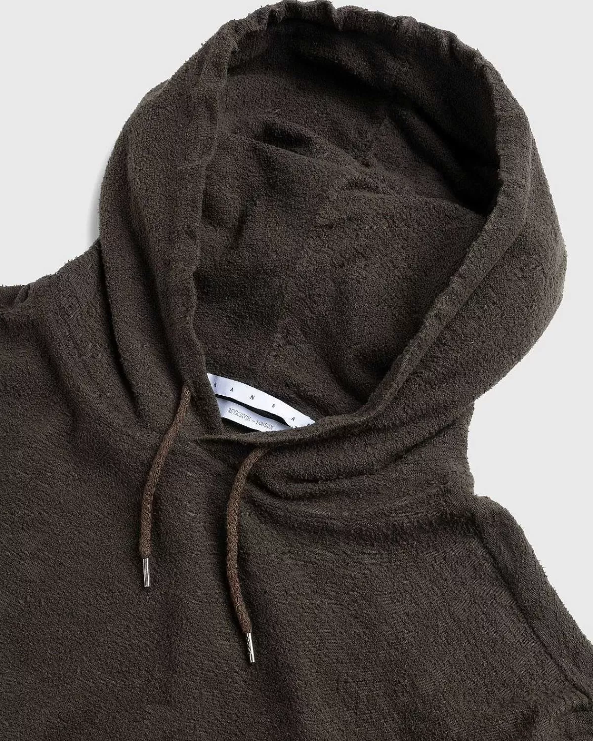 The Over Er En Monokromatisk Hættetrøjestil Af Ranra, Udbydes I En Neutral Brun Farvevariant Til Sæsonen. Den Er Lavet Af 100 % Bomuld Og Har Traditionelle Designelementer, Inklusive En Justerbar Hætte Med Snøre, Ribstrikket Kant Ved Manchetterne Og Forneden Og En Frontlomme.