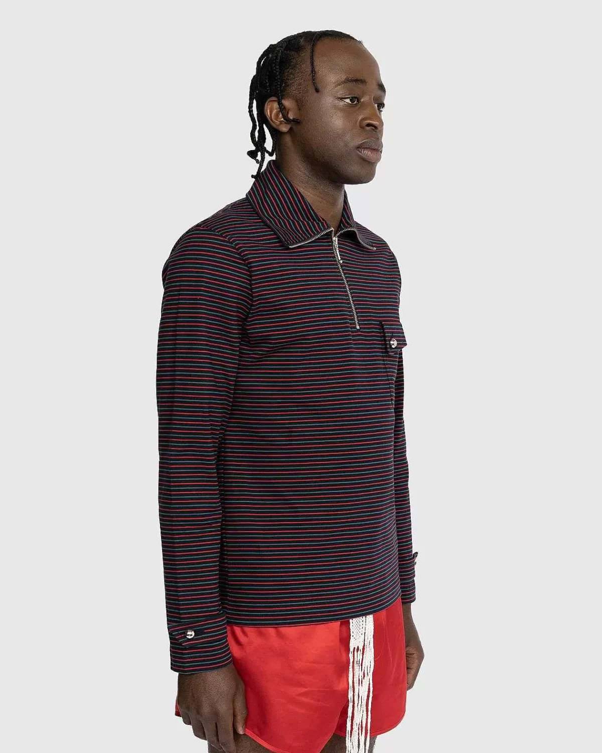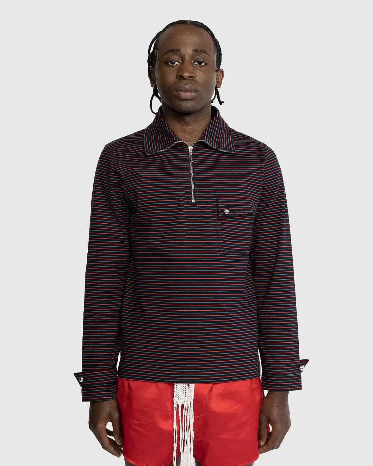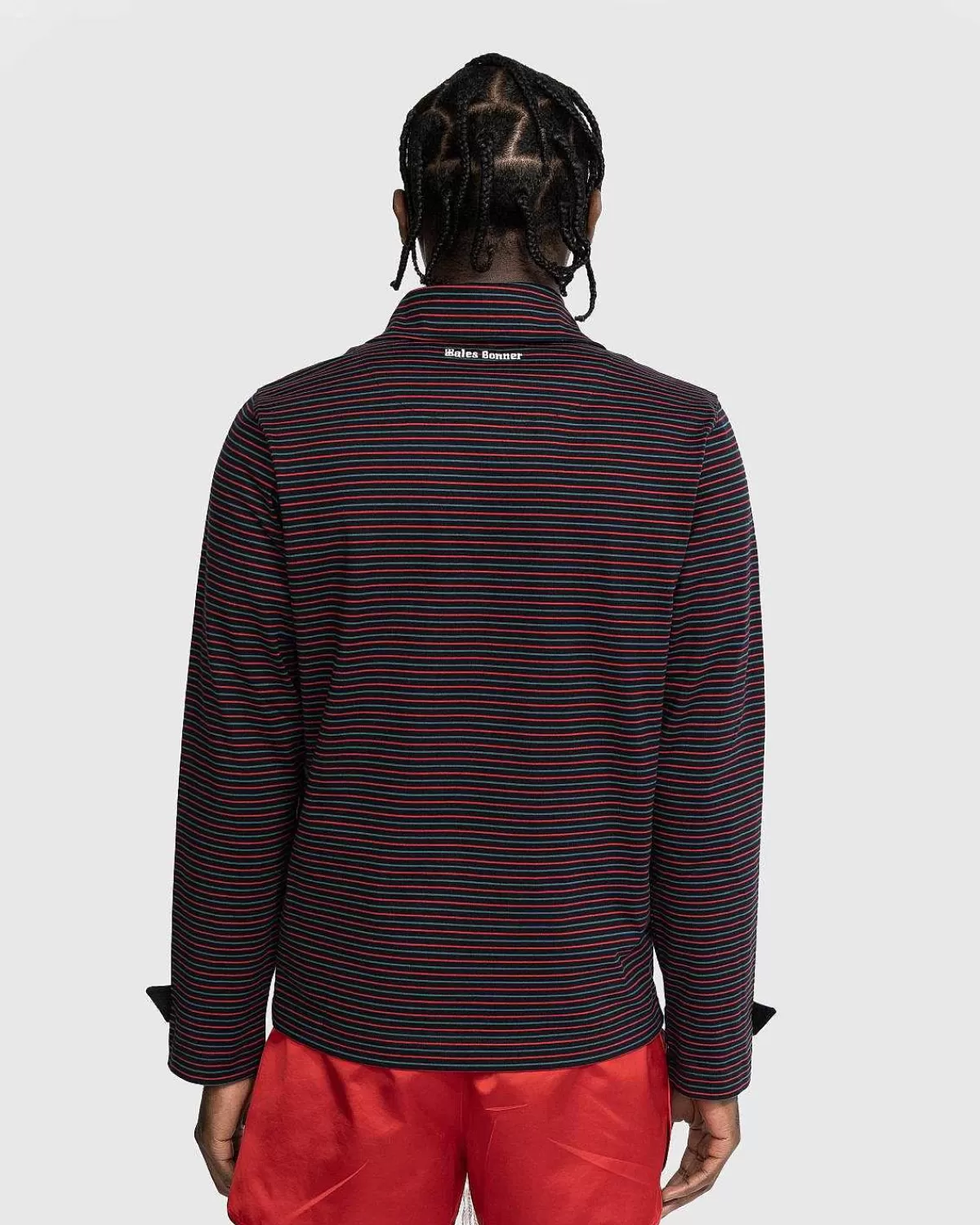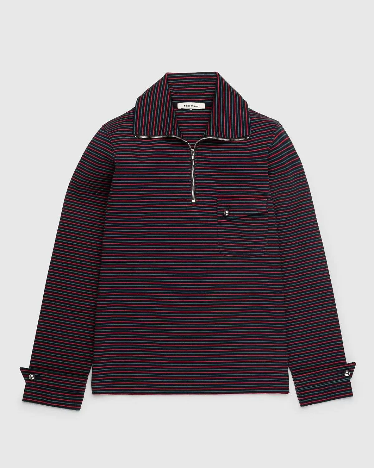 Francos Halve Lynlås Er Defineret Af Vandrette Striber Udført I Nuancer Af Skarlagenrød, Marineblå Og Smaragd. Konstrueret Af 100% Bomuld, Toppen Er Detaljeret Med Metal Lynlås Lukning, Knap Manchetter Og En Knap Brystlomme. Branding Opstår På Bagsiden Af Tøjet I Form Af Et Kontrasterende Wales Bonner-Logo.