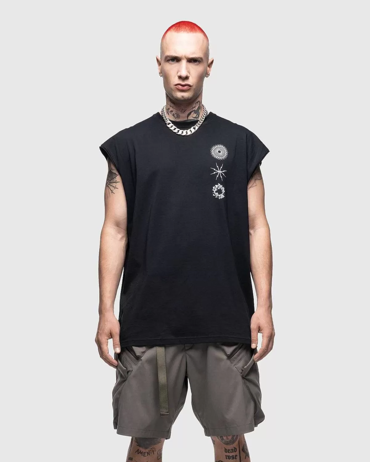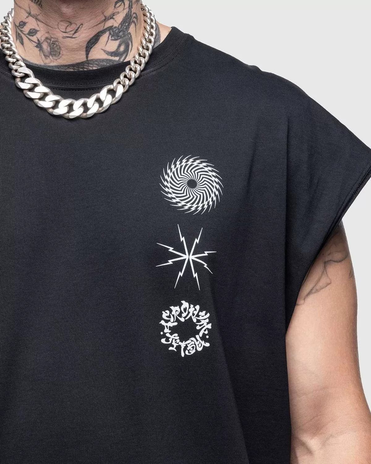 S25-Pr-C Er En Sæsonbestemt T-Shirt-Stil Lavet Af Ultrablødt Pima-Bomuld. T-Shirten Er Ærmeløs Og Har En Traditionel Ribstrikket Rund Hals, Med Silketryksdetaljer Implementeret På Forsiden Såvel Som På Bagsiden. Den Er Skåret I En Overdimensioneret Pasform For En Ekstra Komfortabel Og Moderigtig Brug.