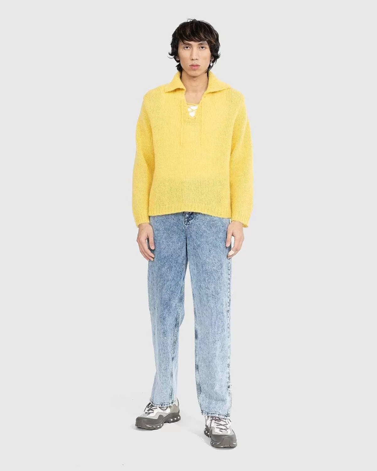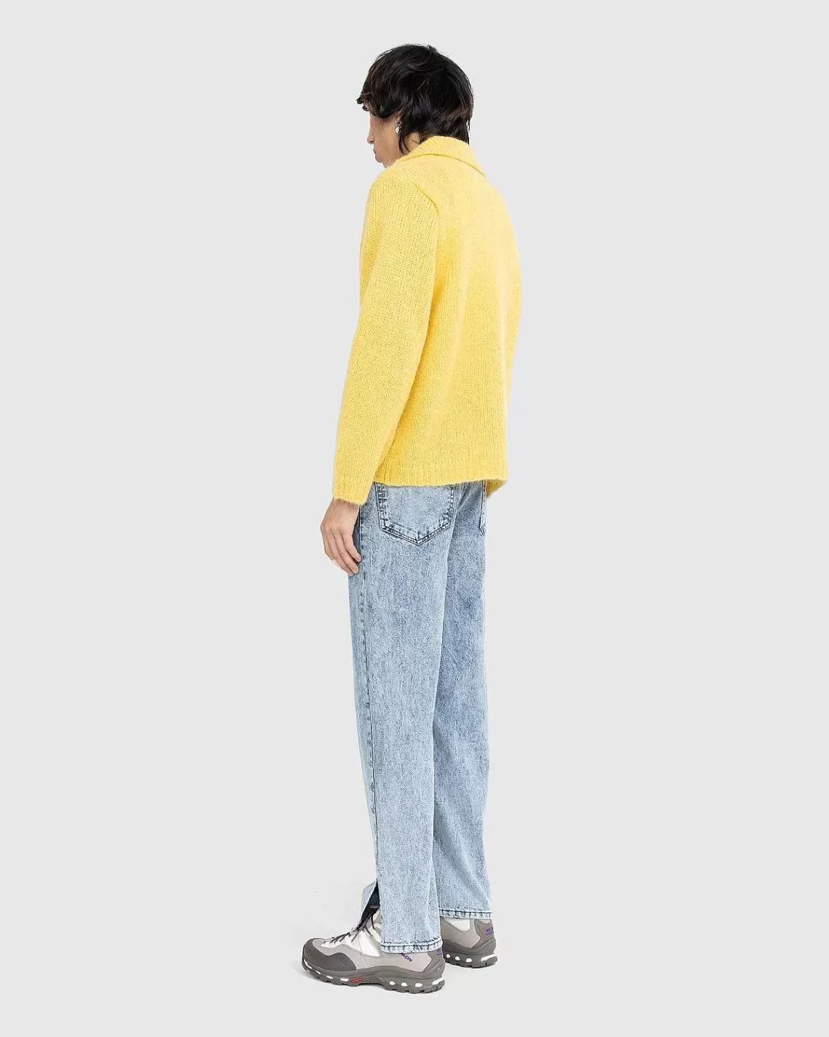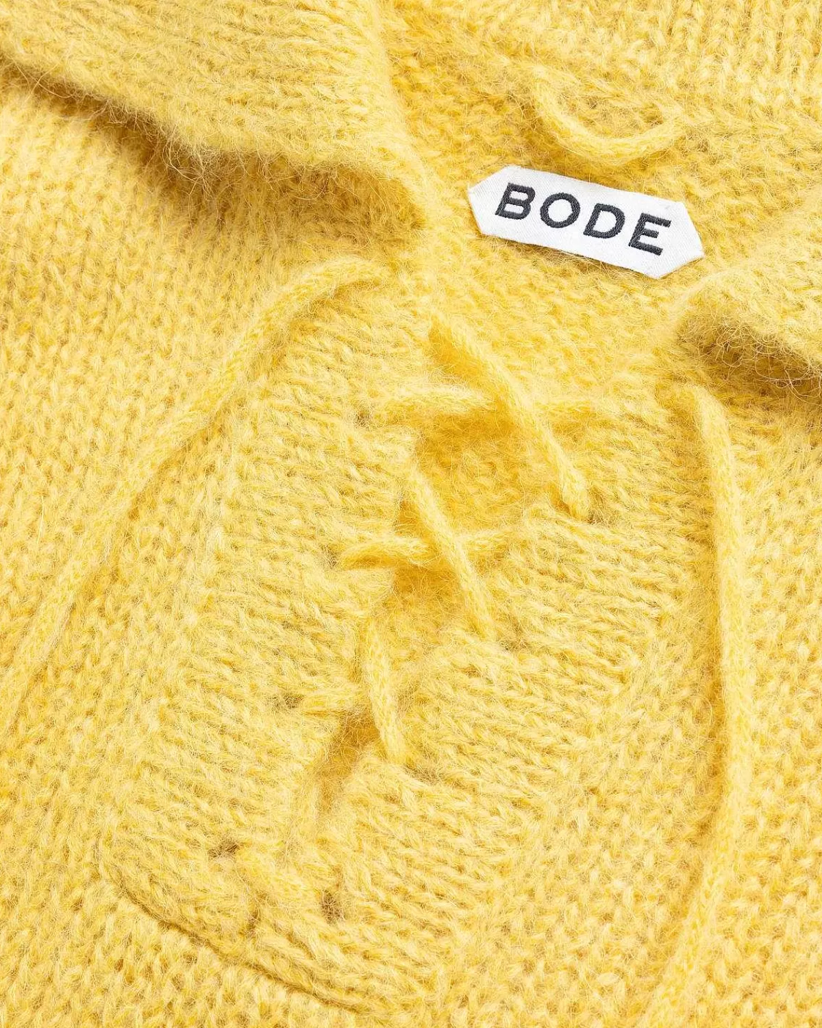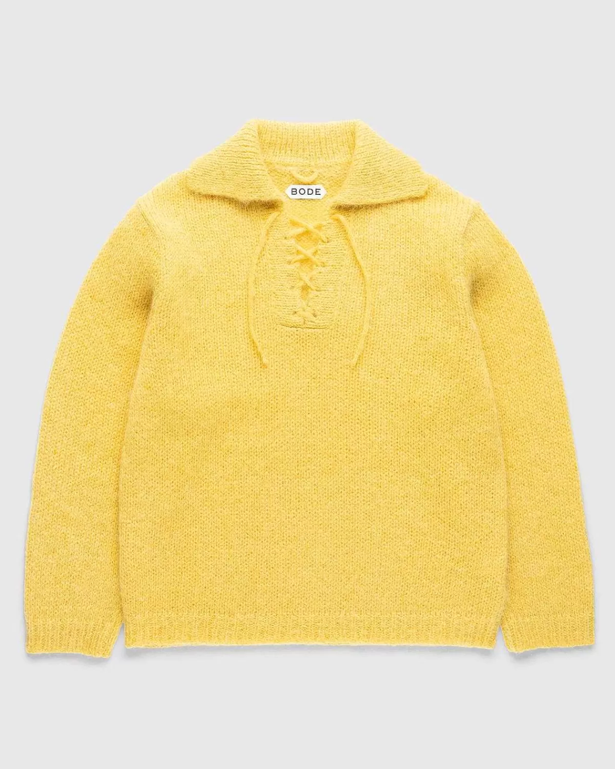 Denne Bløde, Gulfarvede Trøje Henter Inspiration Fra En Sweater Omkring 1970’Erne. Bode Gengav Igen Silhuetten For Sin Nye Sæsonkollektion, Da Det Hyggelige Tøj Er Udført I Et Plys Mohair- Og Alpakablandingsstof. Det Er Defineret Af En Snøret Halsudskæring, Med Yderligere Detaljer, Der Inkluderer En Krave Og En Lige Søm.