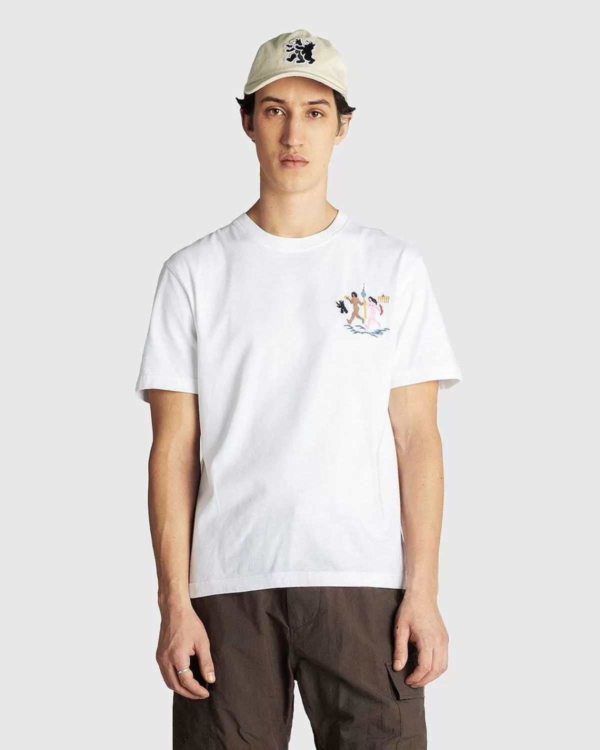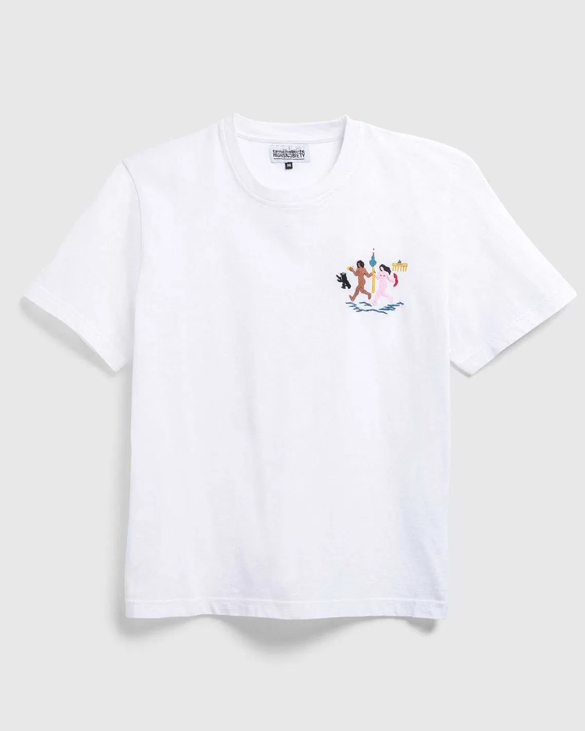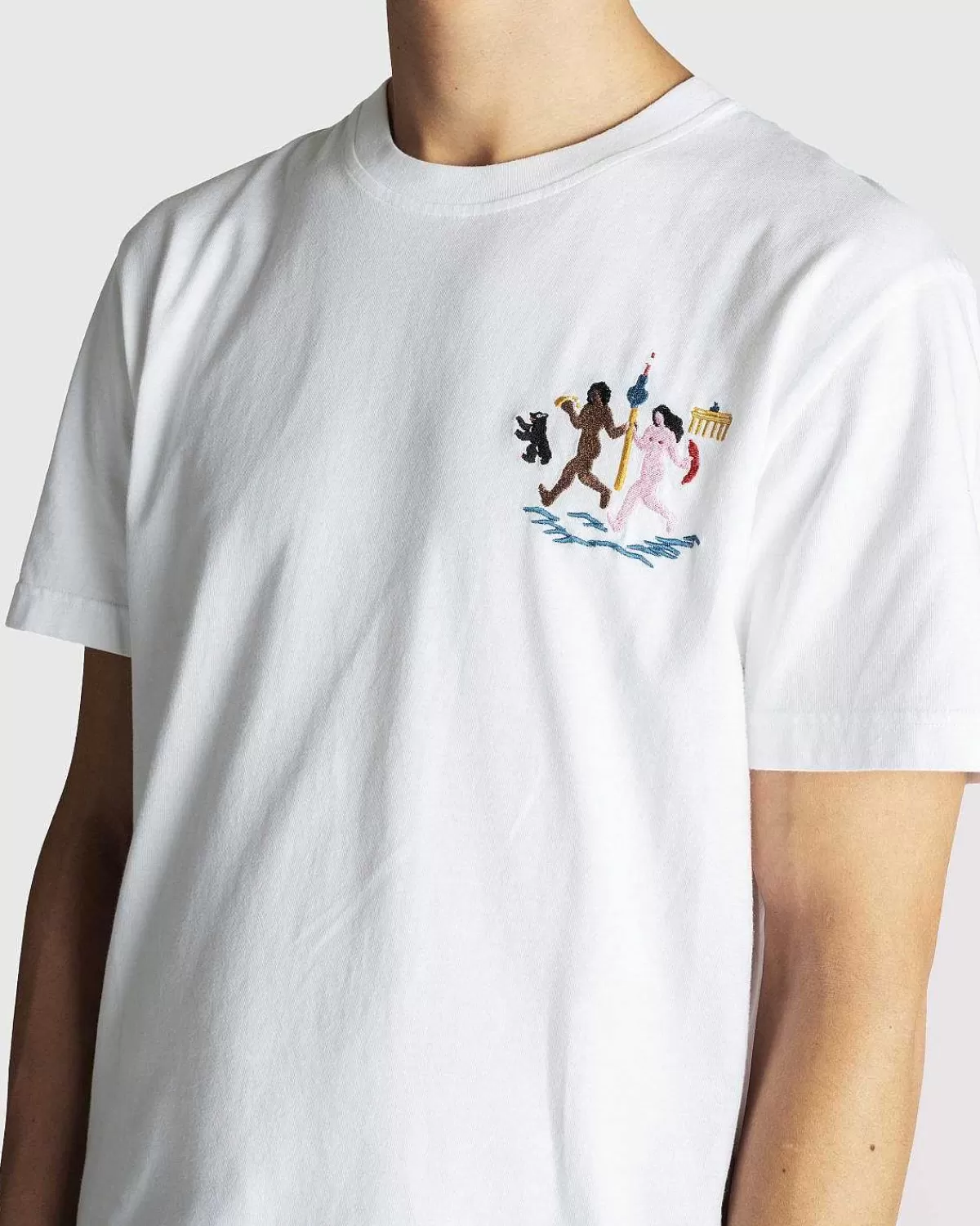 The Berliner Love Affair T-Shirt Er Lavet Udelukkende Af Organisk Bomuld Og Inkarnerer Etosen Fra Berlins Korte Og Søde Sommer. Nøgen Og Boltrer Sig Med Pølser Og Ølkrus På Slæb. Samarbejdskruset Indeholder Flere Af Byens Vartegn Samt Dens Ikoniske Maskot.