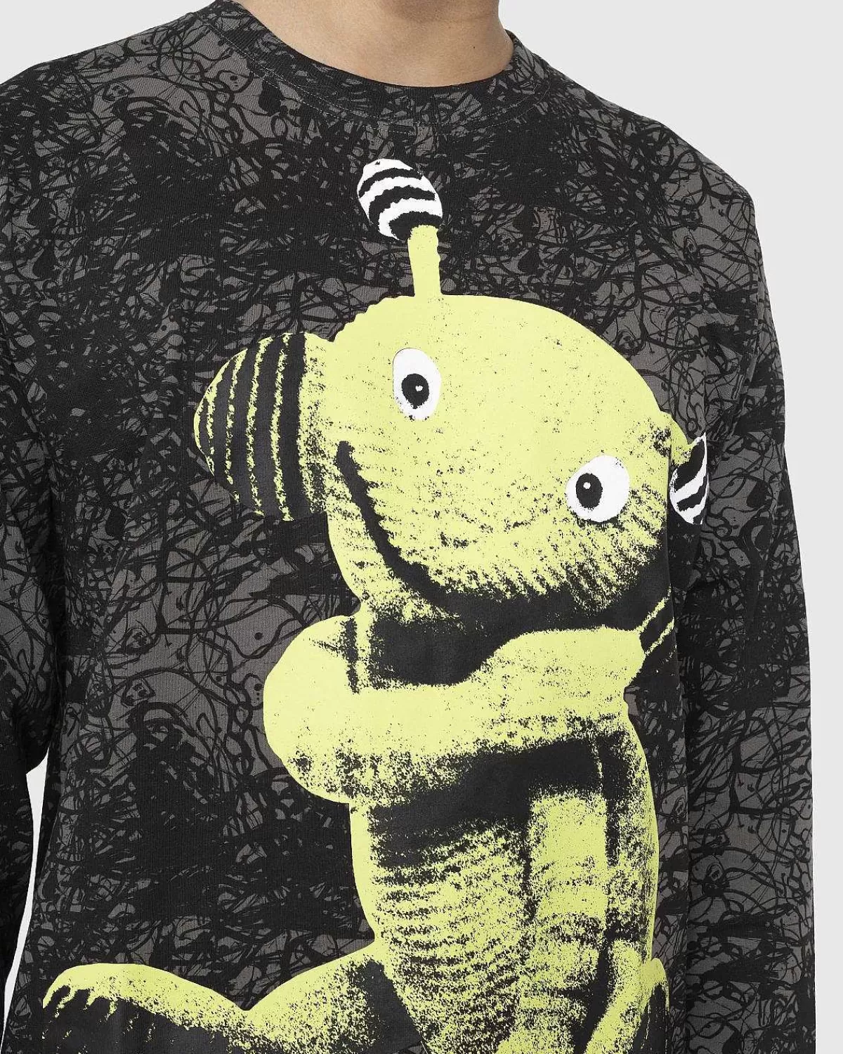 The Alien Puppet Tee Er Lavet Eksklusivt Til Story Mfg.’S Seasonal Gentle Fullness Collection. Den Langærmede Top Er Konstrueret Af 60 % Genbrugsbomuld Og 40 % Økologisk Bomuld, Og Er Øko-Farvet, Dekoreret Med Et Legende Alien-Print På Forsiden Af Silhuetten. Skjorten Er Detaljeret Med En Traditionel Ribstrik Rund Hals Og Manchetter Og Har En Afslappet, Boxy Pasform.