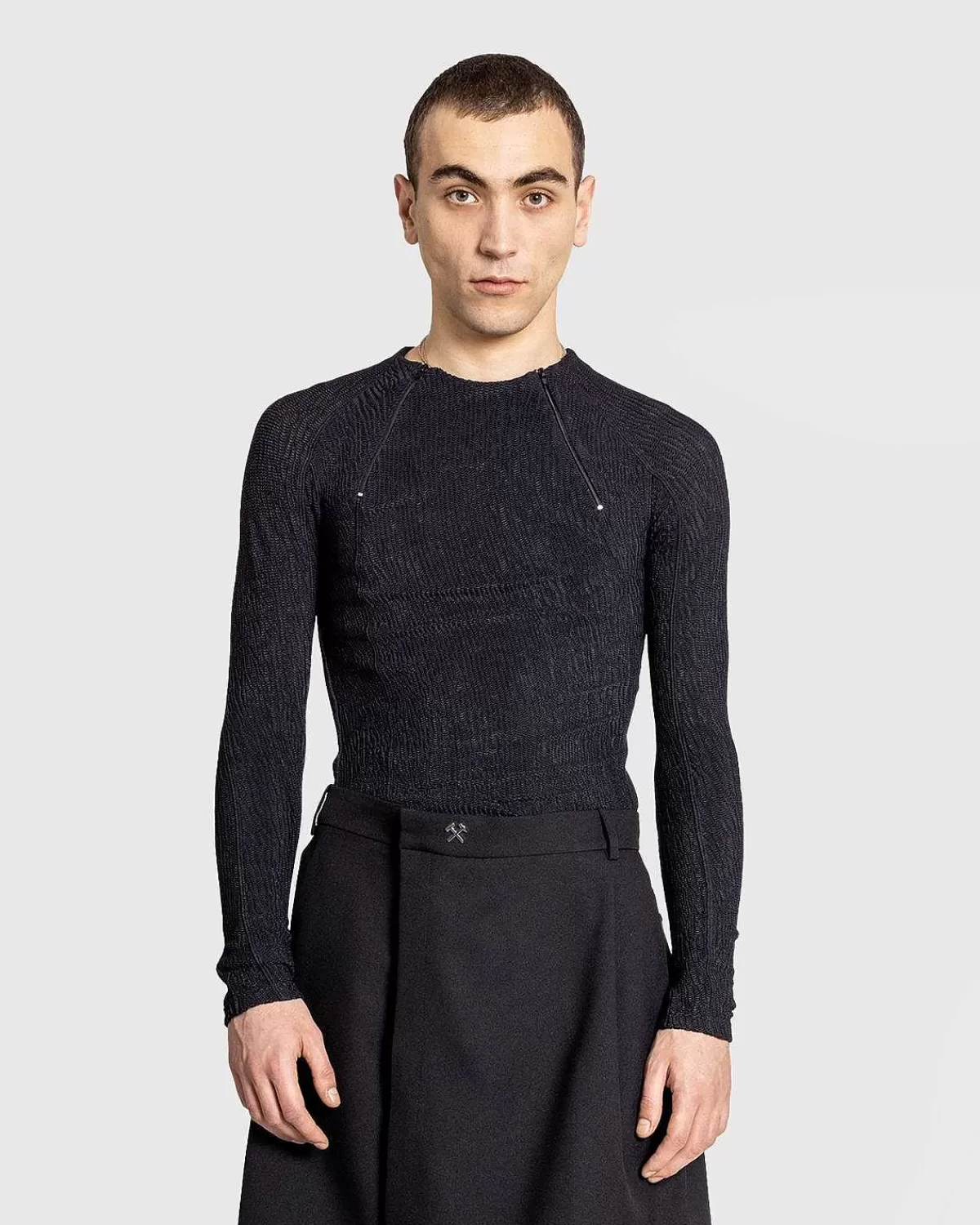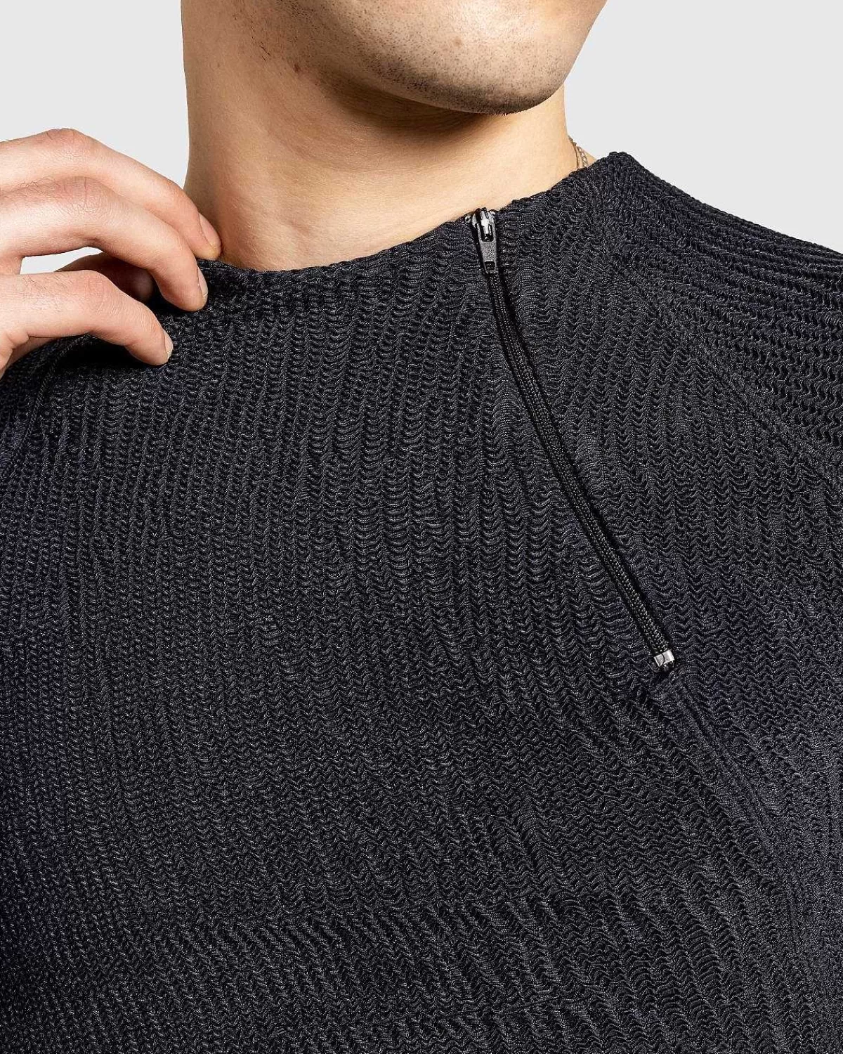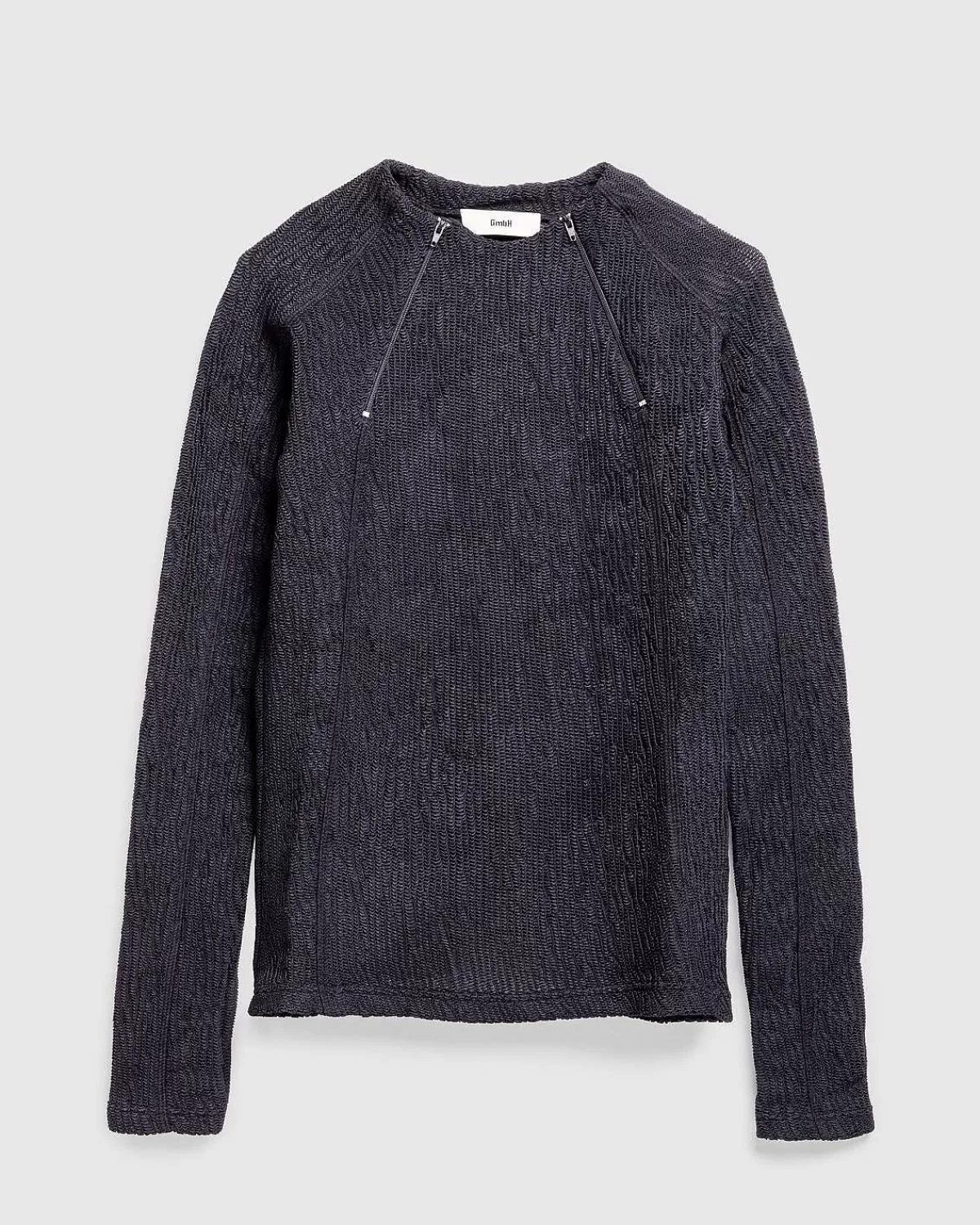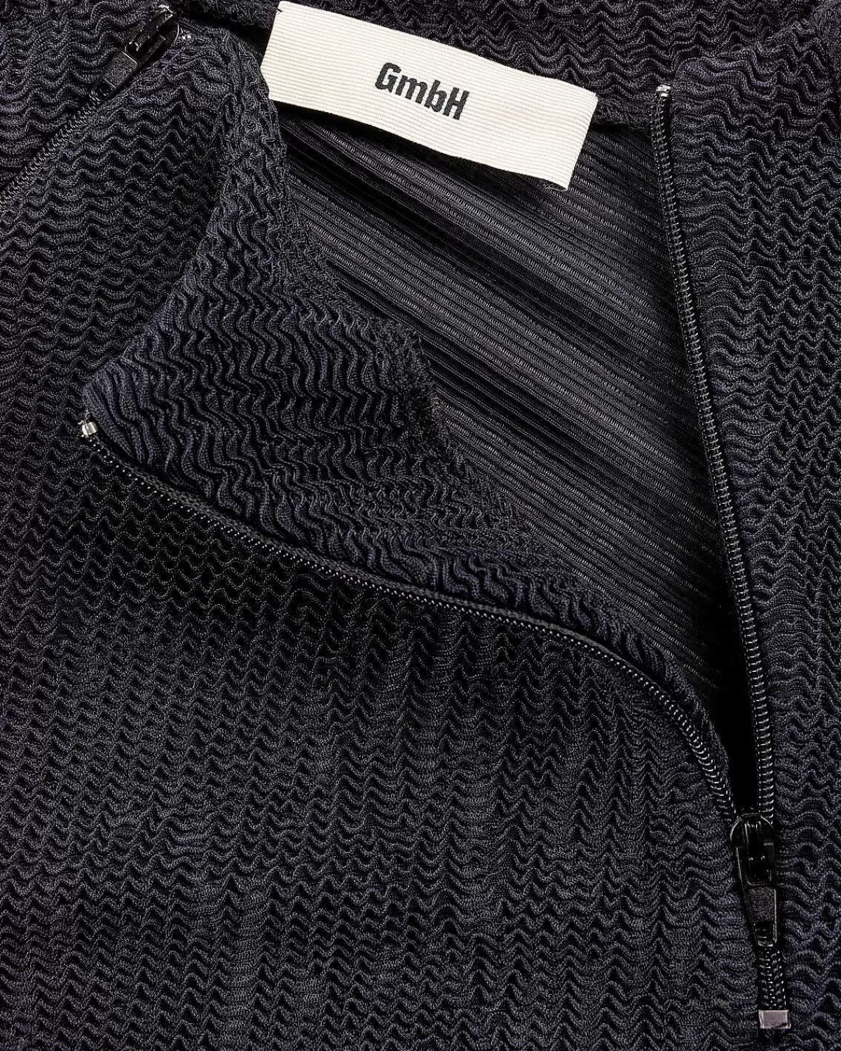 Stilarter Som Deema Rashguard Find Gmbh, Der Gør Traditionelt Aktivtøjstøj Til Livsstilsædelstene. Som Med De Fleste Stykker Af Mærket, Er Toppen Unisex, Her Med Et Tilpasset Snit. Den Er Produceret I Et Genbrugt Nylonjerseystof, Der Viser Gmbhs Varemærke Dobbelt Lynlås Ved Halsen.