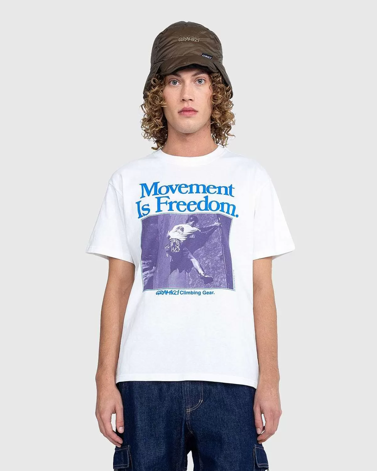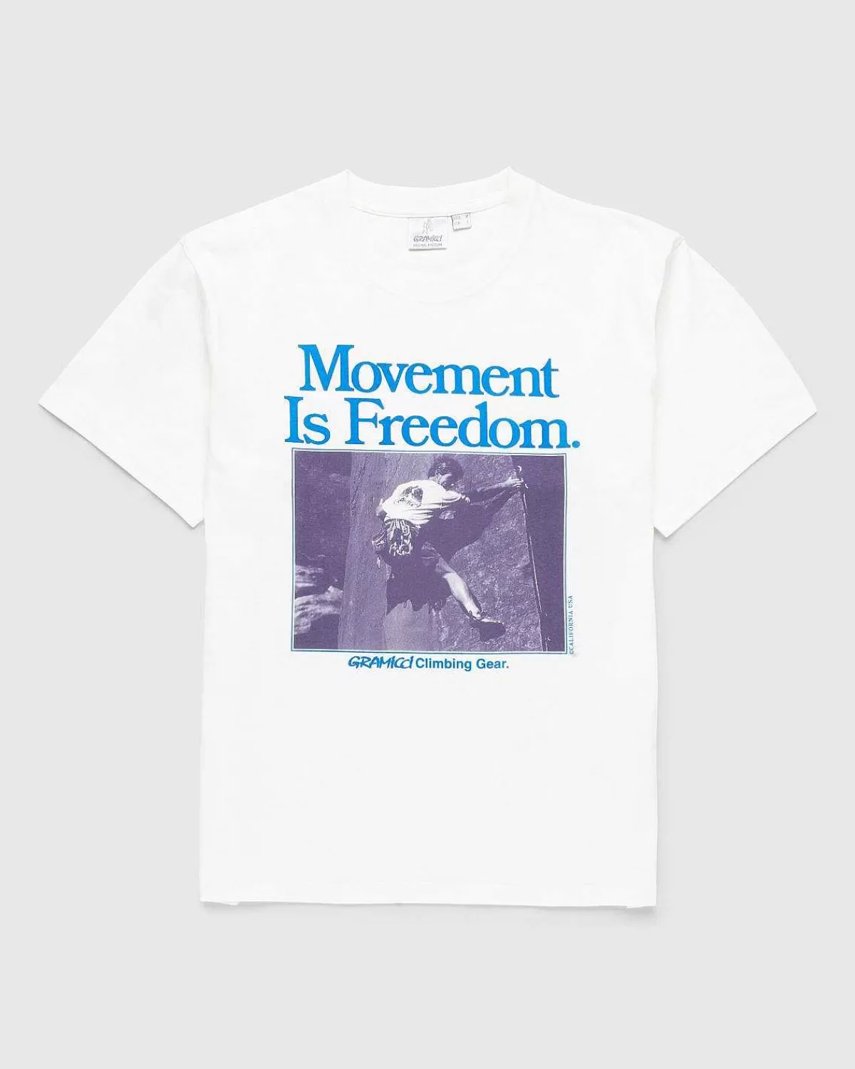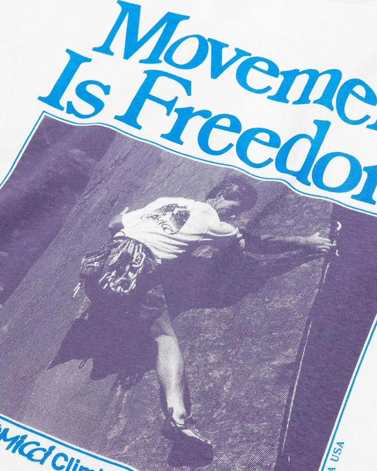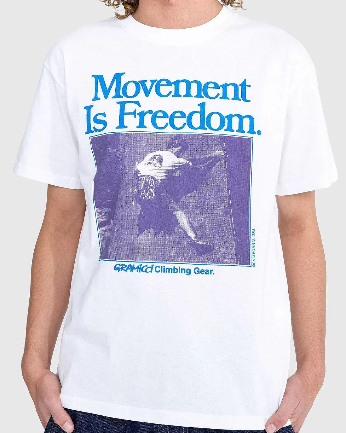 Bevægelses-T-Shirten Er En Sæsonbestemt Grafisk Stil Fra Gramicci, En Der Indeholder Et Foto Fra 1980’Erne Af En Bjergbestiger Og Sloganet “Bevægelse Er Frihed.” Den Er Lavet Af Tør-Touch Økologisk Bomuld Og Har En Traditionel Ribstrikket Rund Hals. Standard Boxy Fit Sikrer Et Klassisk, Tidløst Slid.