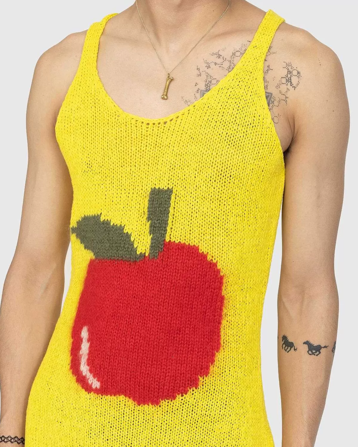 Jw Andersons Seneste Tilbud Er Fyldt Med Nye Prints Og Grafik, Og Ser Æblet Som Omdrejningspunktet For Mærkets Sæsonkollektion. Denne Livlige Intarsia-Striktank Er Blød At Røre Ved Og Har En Udskæring Med En Ribkant I En Lys Gul Finish.