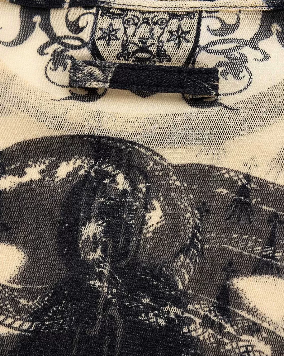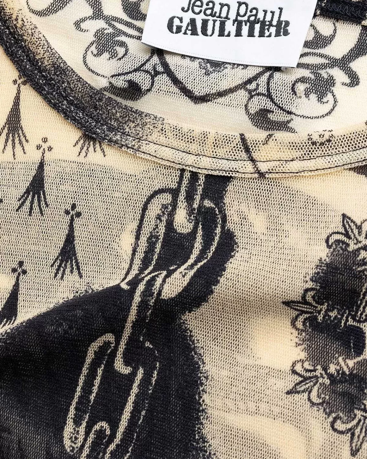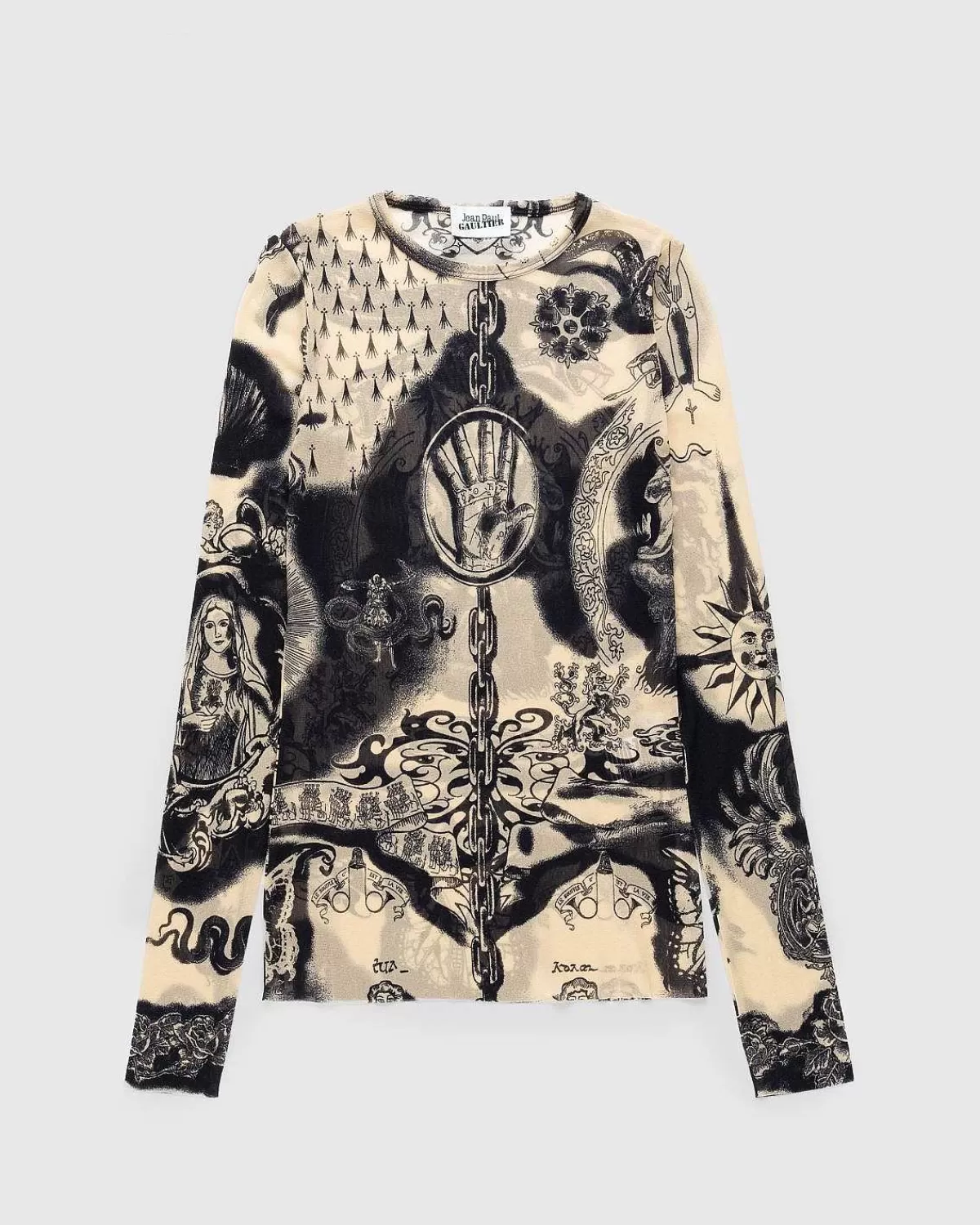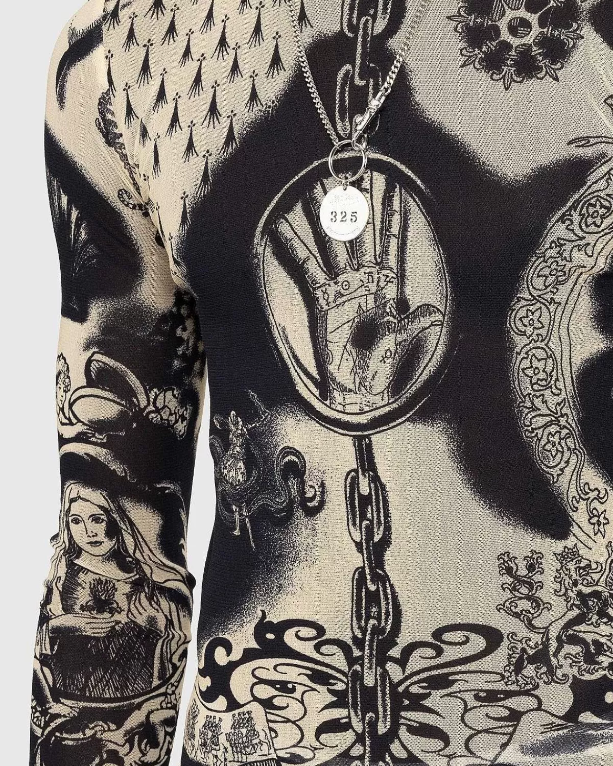 Tatoveringer, Piercinger, Kropsudsmykninger – Alle Er Fair Play I Jean Paul Gaultiers Univers Af Klar-Til-Brug Stykker. Mærkets Seneste Tatoveringskollektion Gensøger Sit Arkiv Af Strækbare, Gennemsigtige Silhuetter Som Den Heraldikiske Tatoveringsoverdel, Der Er Fremstillet Udelukkende Af Tyl. Detaljeret Med All-Over Printede Heraldikmotiver, Herunder Keruber, Et Våbenskjold Og Adskillige Dyr, Den Nøgenfarvede Top Er Afsluttet Med Lange Ærmer Og En Rund Halskrave.