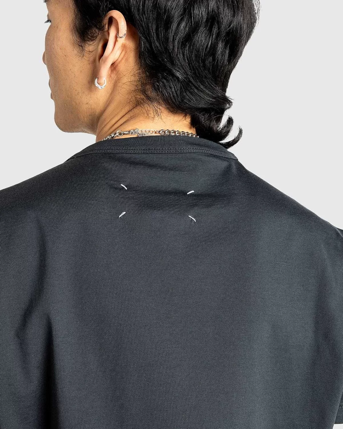 Maison Margiela Vender Manuskriptet Med Denne Sæsonbestemte Logo-T-Shirt, Da Den Kan Prale Af Et Margiela Paris-Logo På Hovedet, Der Er Broderet På Forsiden. Omkring Bagsiden Finder Du Etikettens Signatur Fire Sømme Moniker For Tilføjet Udsmykning.