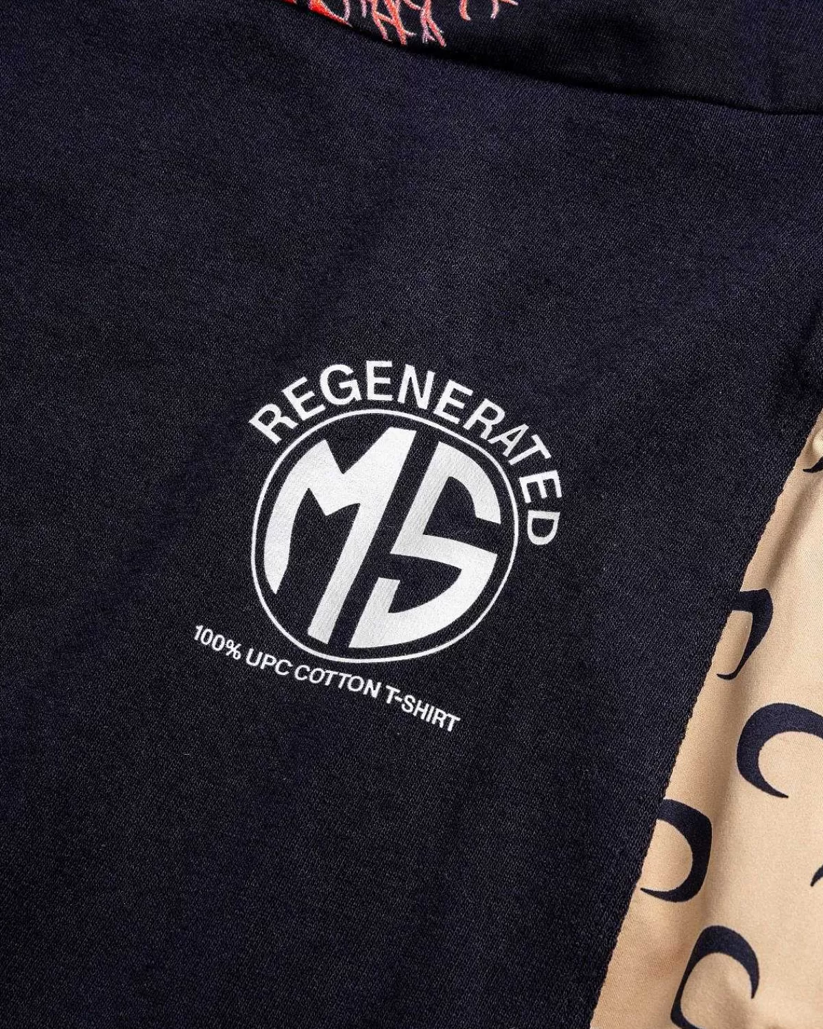 Denne Marine Serre-Top Viser Et Iøjnefaldende Patchwork-Design Og Er Regenereret Fra Upcyclede T-Shirts. Unisex-T-Shirten Er Lavet Af 100 % Bomuld Og Bragt Til Live Med Logodetaljer Implementeret I Hele Den Tilpassede Silhuet. Hver T-Shirt Er Unik Og Lavet Ved Hjælp Af Forskellige Upcyclede Skjorter.