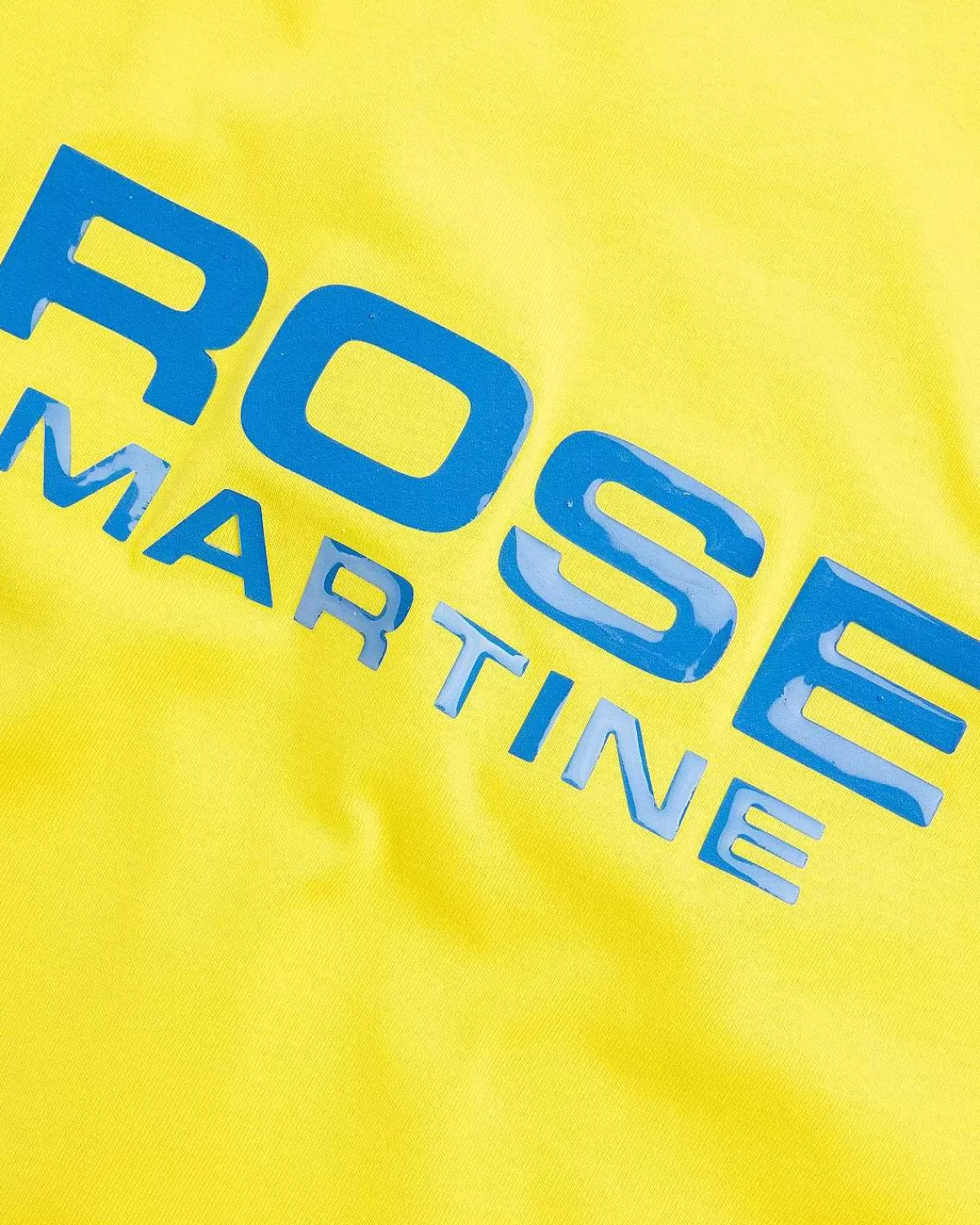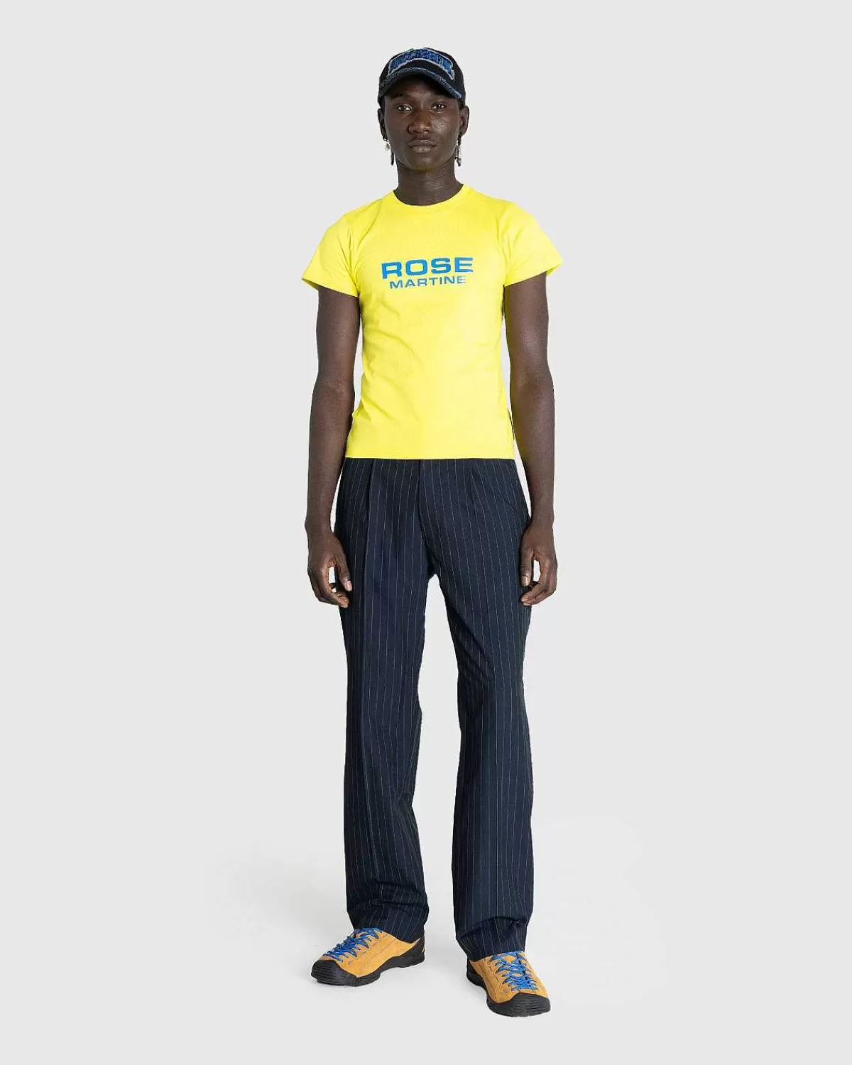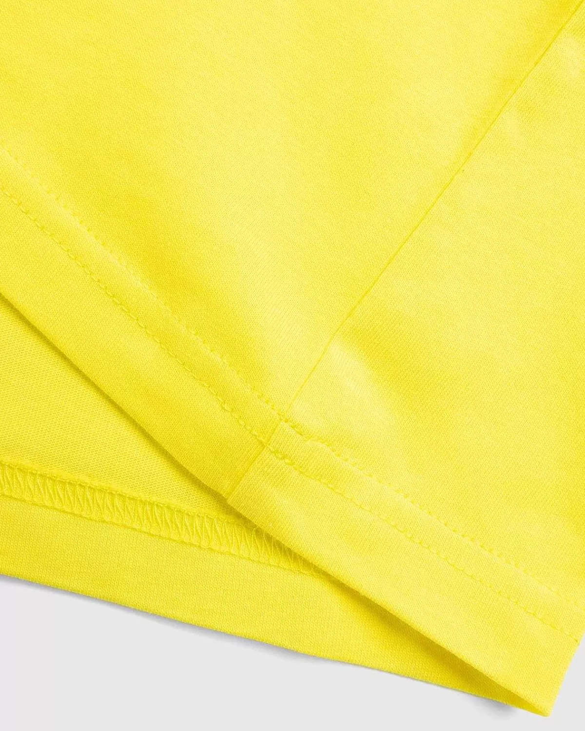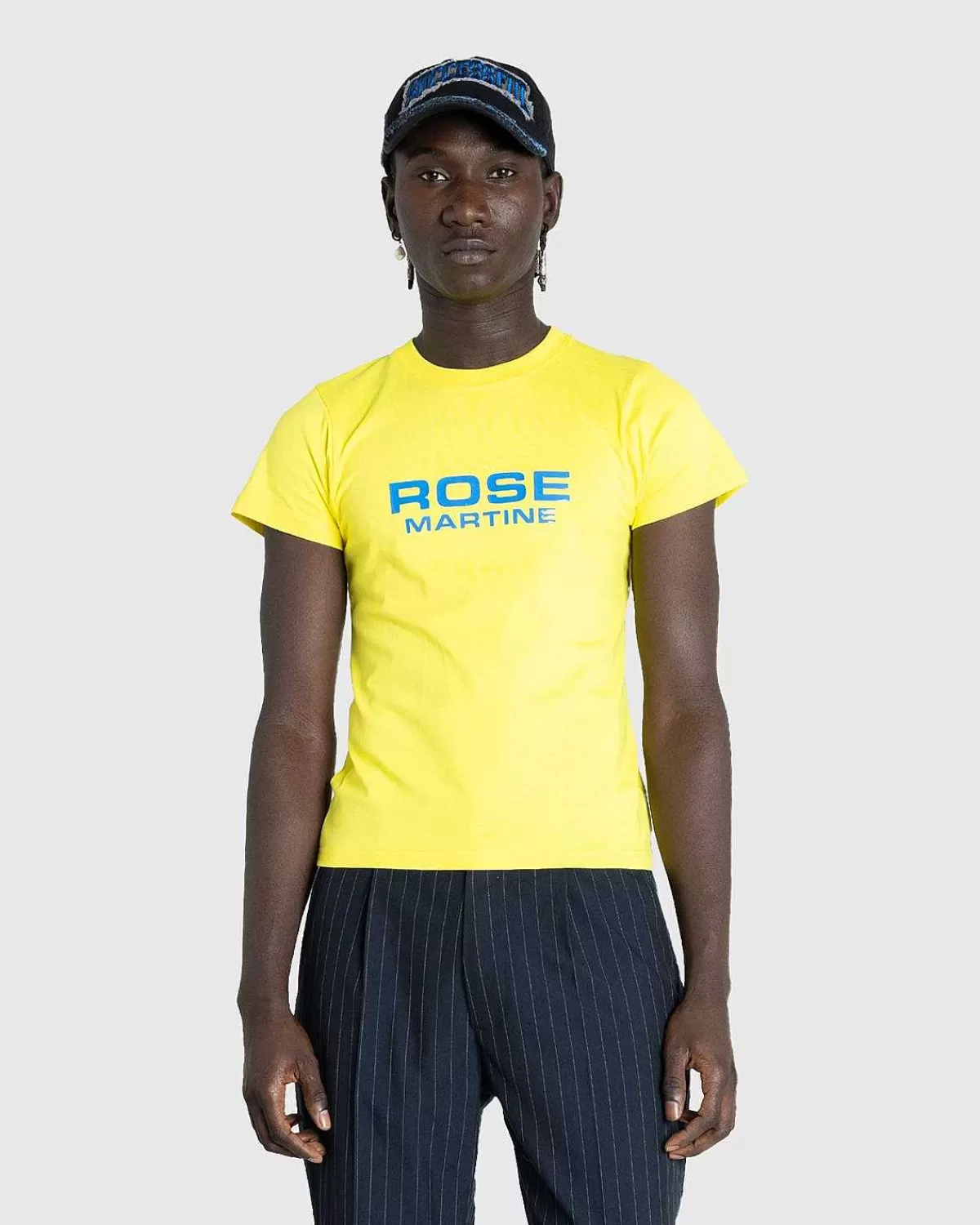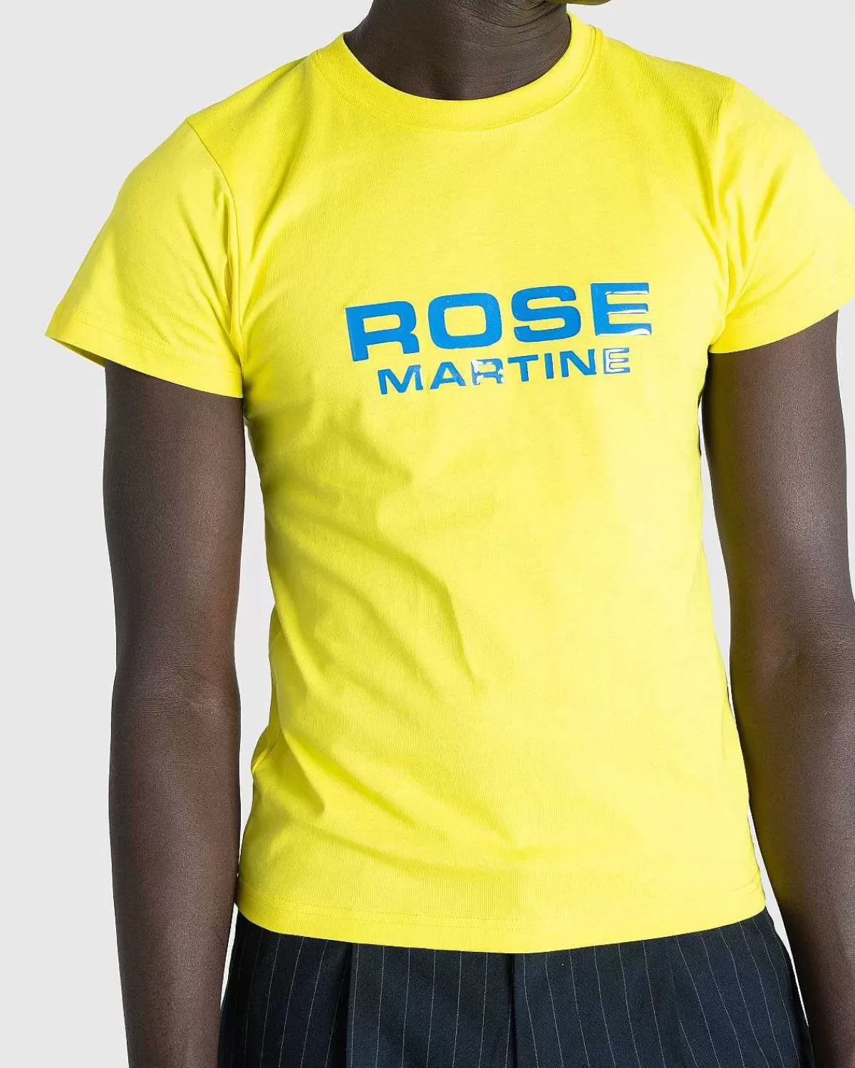 Den Krympede T-Shirt Er Dekoreret Med Et Årstidens Silikone-Gel-Printet Martine Rose-Logo På Brystet. Skåret Til En Tæt Pasform, 100 % Bomuldsoverdelen Er Detaljeret Med En Traditionel Ribstrikket Rund Hals, Der Ankommer I En Levende Gul Farvevariation Med Kontrasterende Blå Ikonografi.