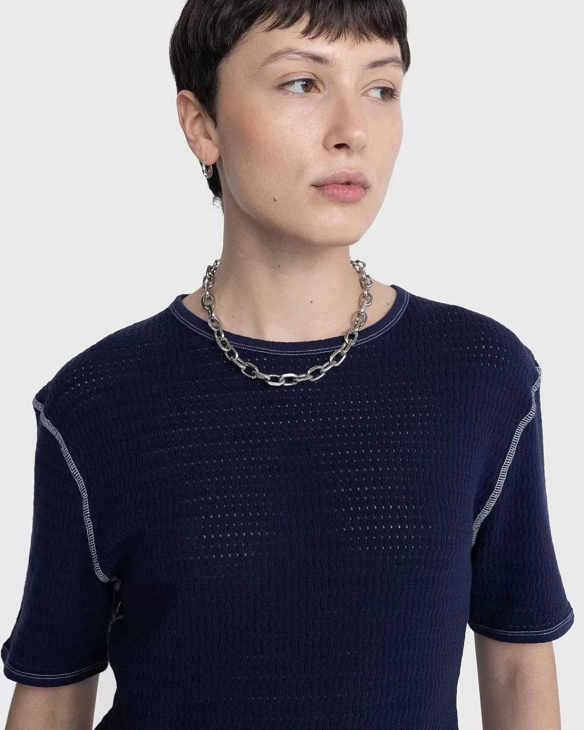 Den Løststrikkede Konstruktion Af Denne T-Shirts Stof Er Lavet Af En Portugisisk Hæklet Mesh-Trøje, Der Gør Den Delvist Gennemsigtig Og Naturligt Ventileret. Skåret Med En Slank, Langstrakt Pasform, Kontrastflatlocksømme Bruges På Tværs Af Skjorten For En Subtil Prikken Over I’Et.