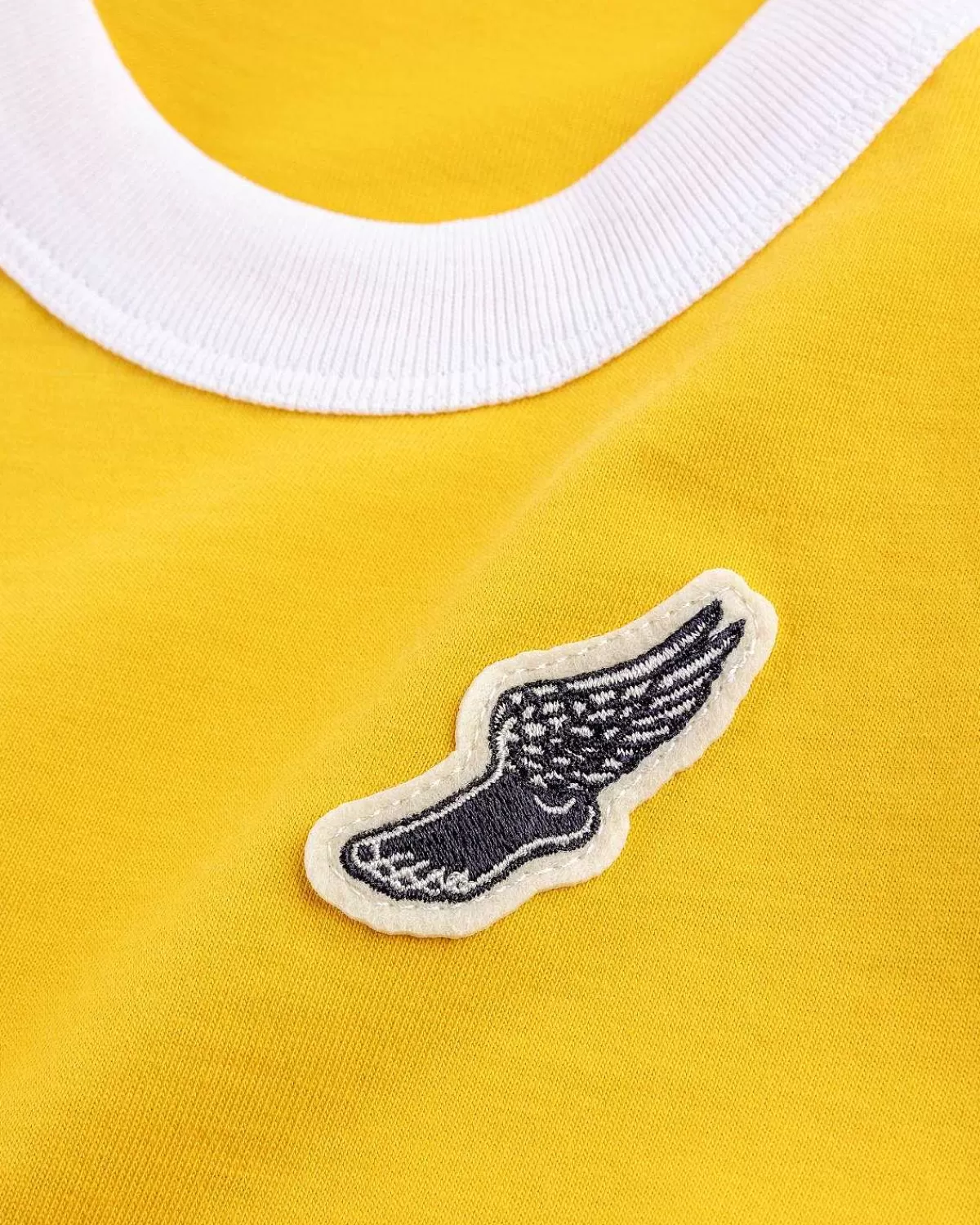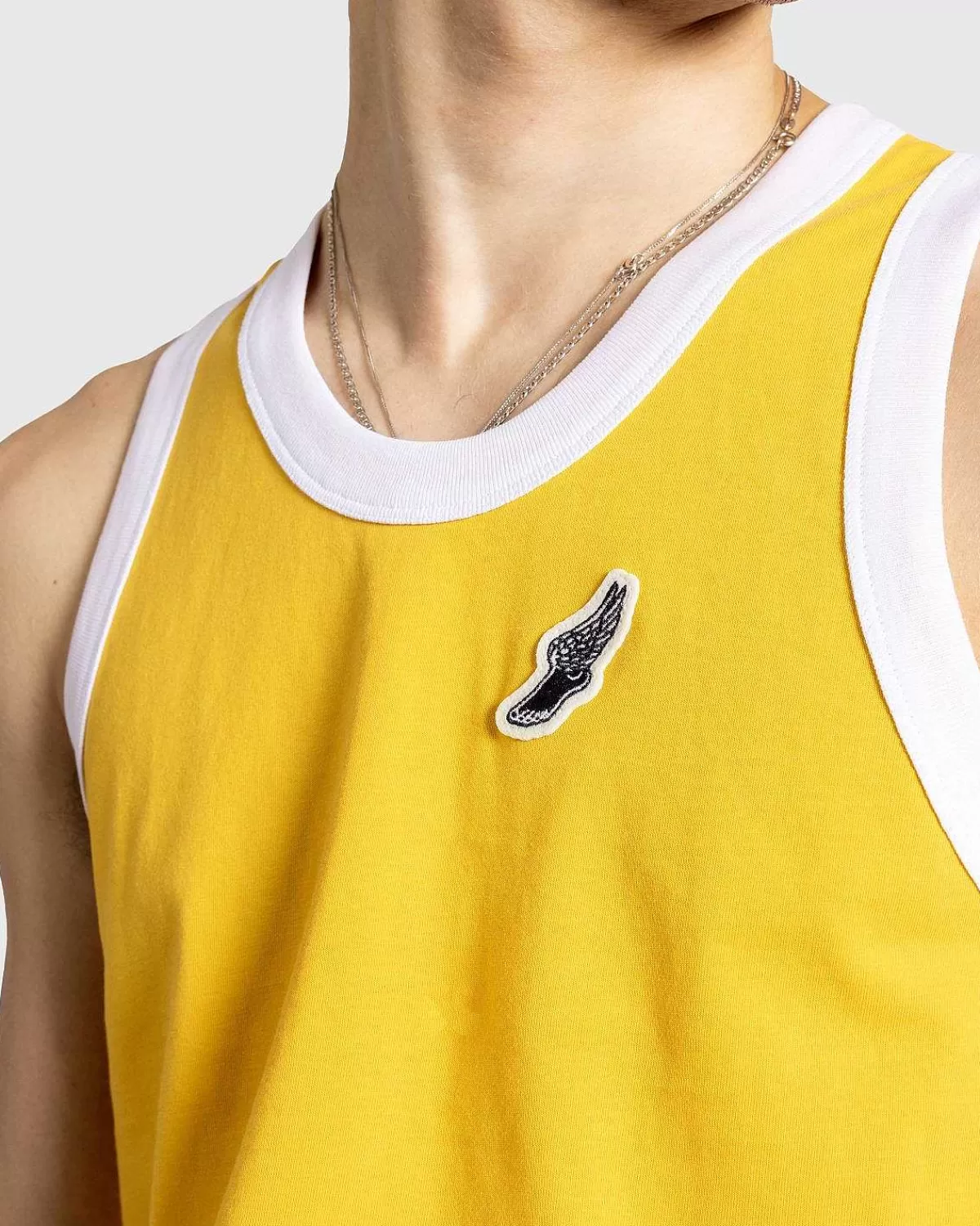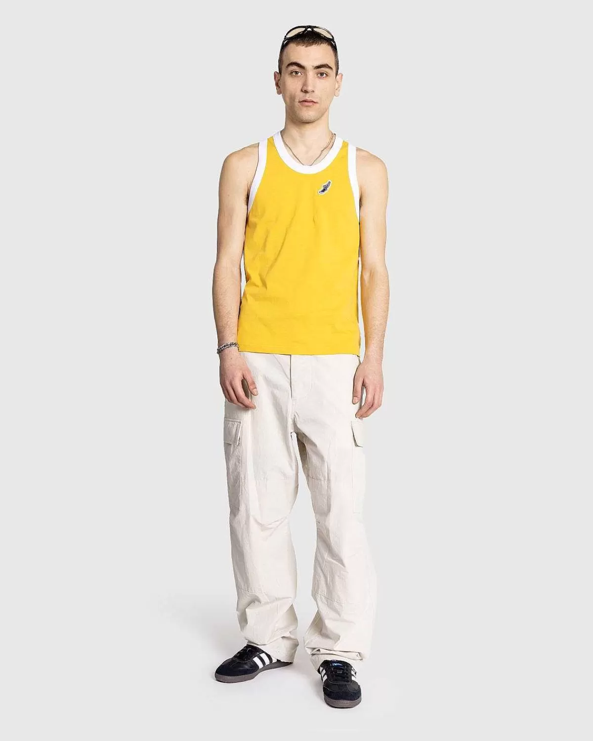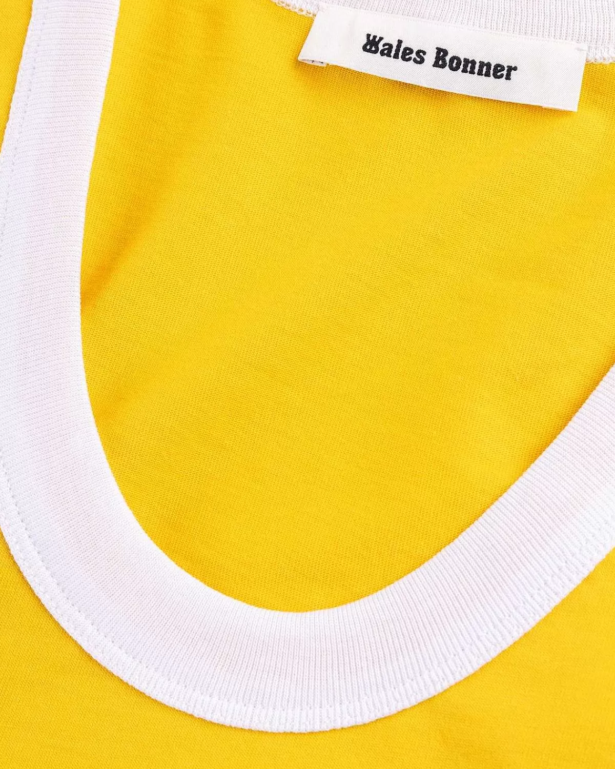 Abebe Tank Top Er En Minimal Wales Bonner Style Produceret I 100 % Økologisk Bomuld. Den Ankommer Til Sæsonen I En Livlig Gul Farvevariant Med Kontrasterende Hvid Trim. Den Ærmeløse Stil Er Subtilt Mærket Med Et Lille Logomærke På Brystet.