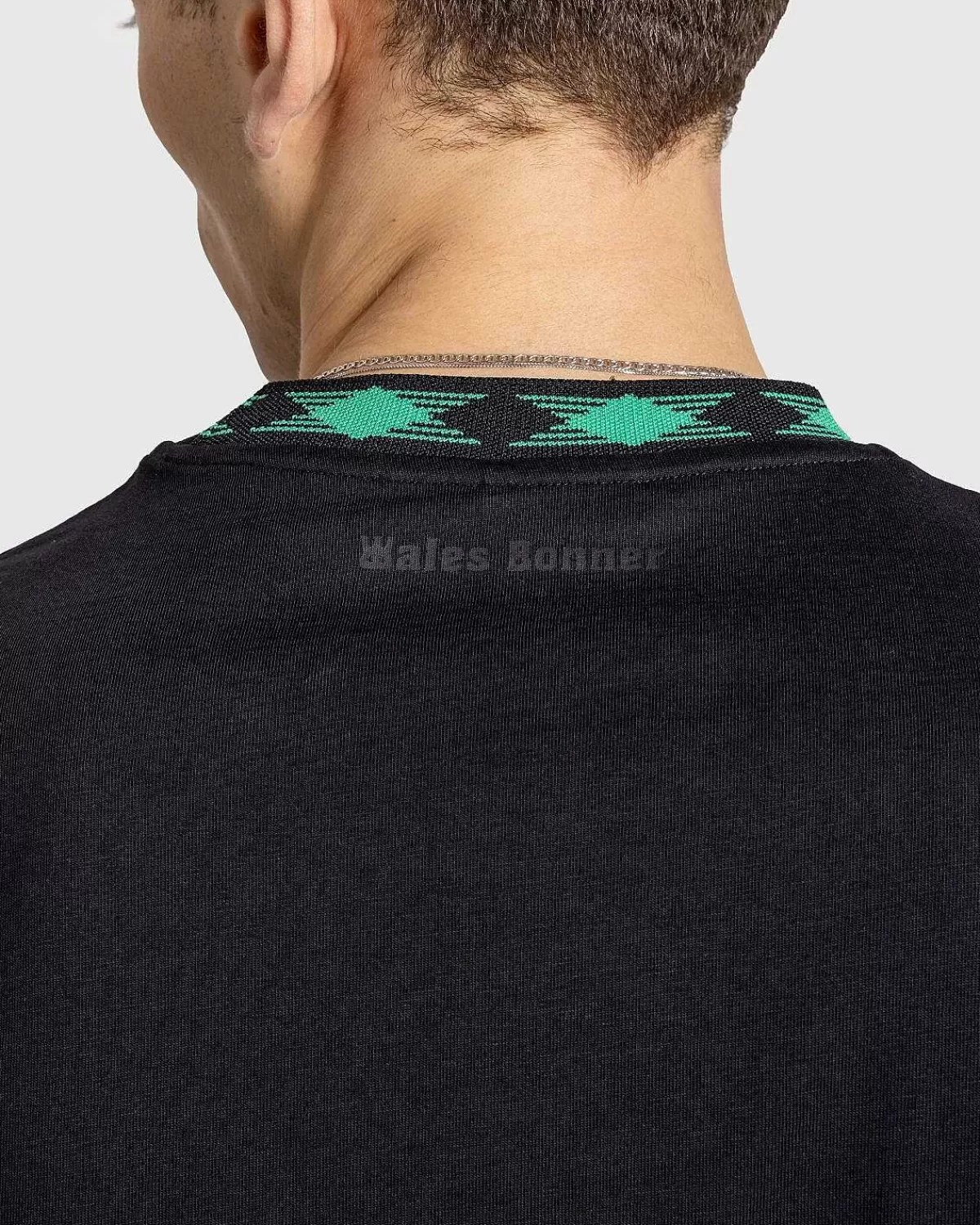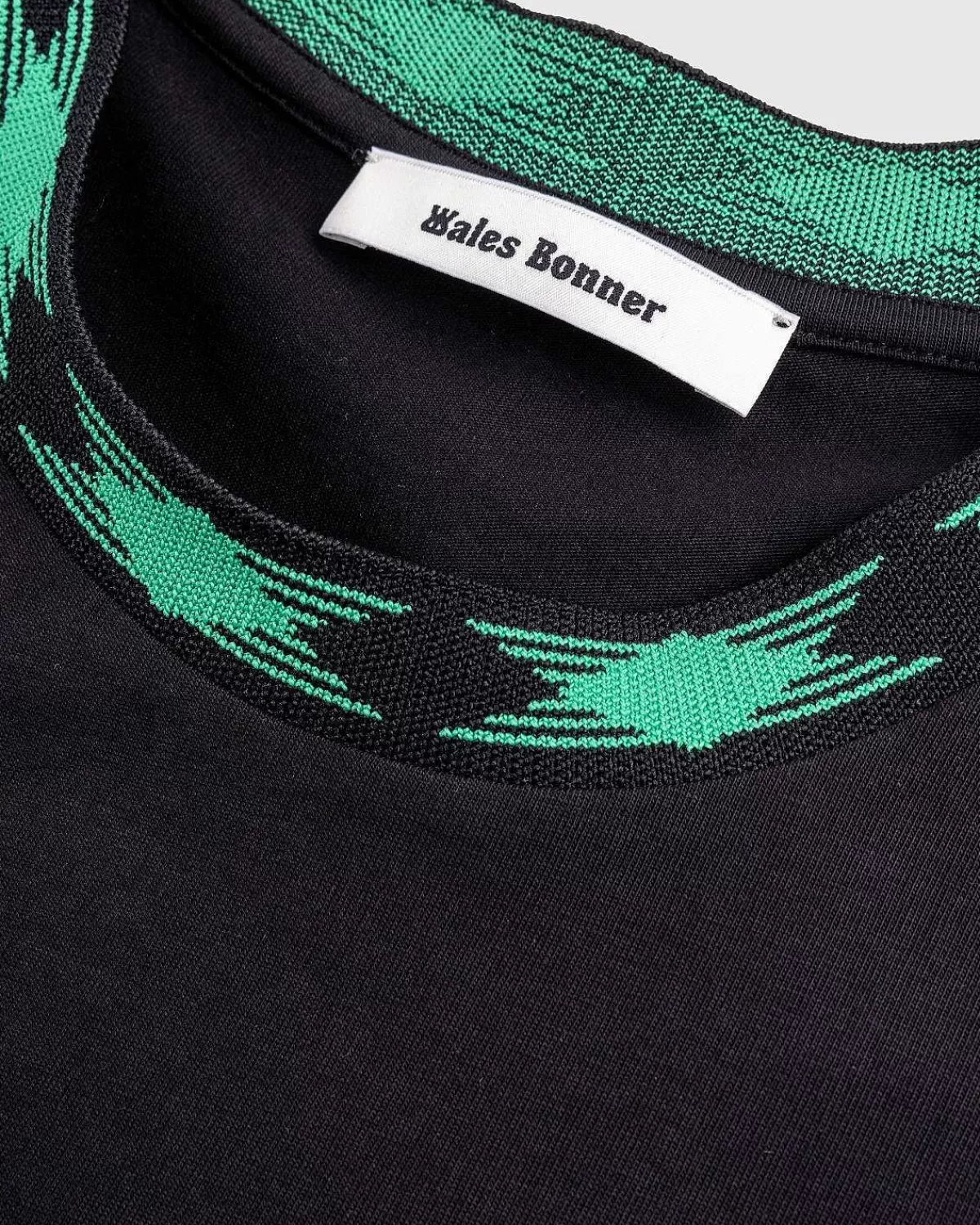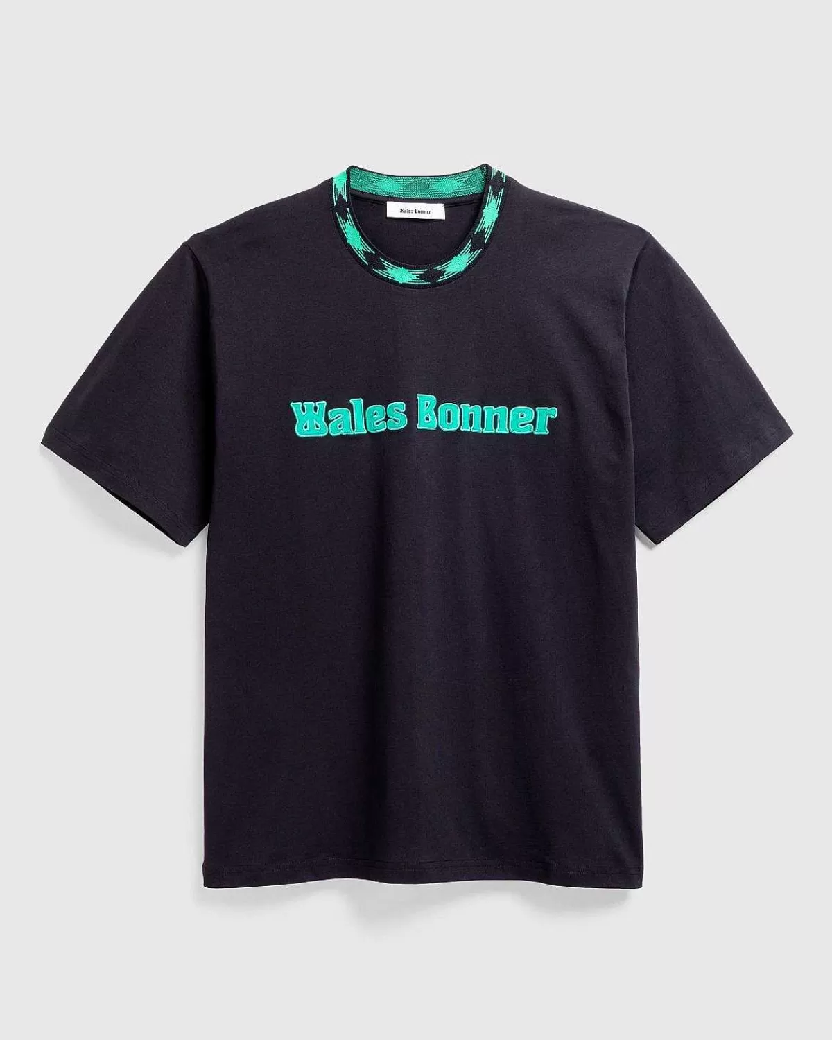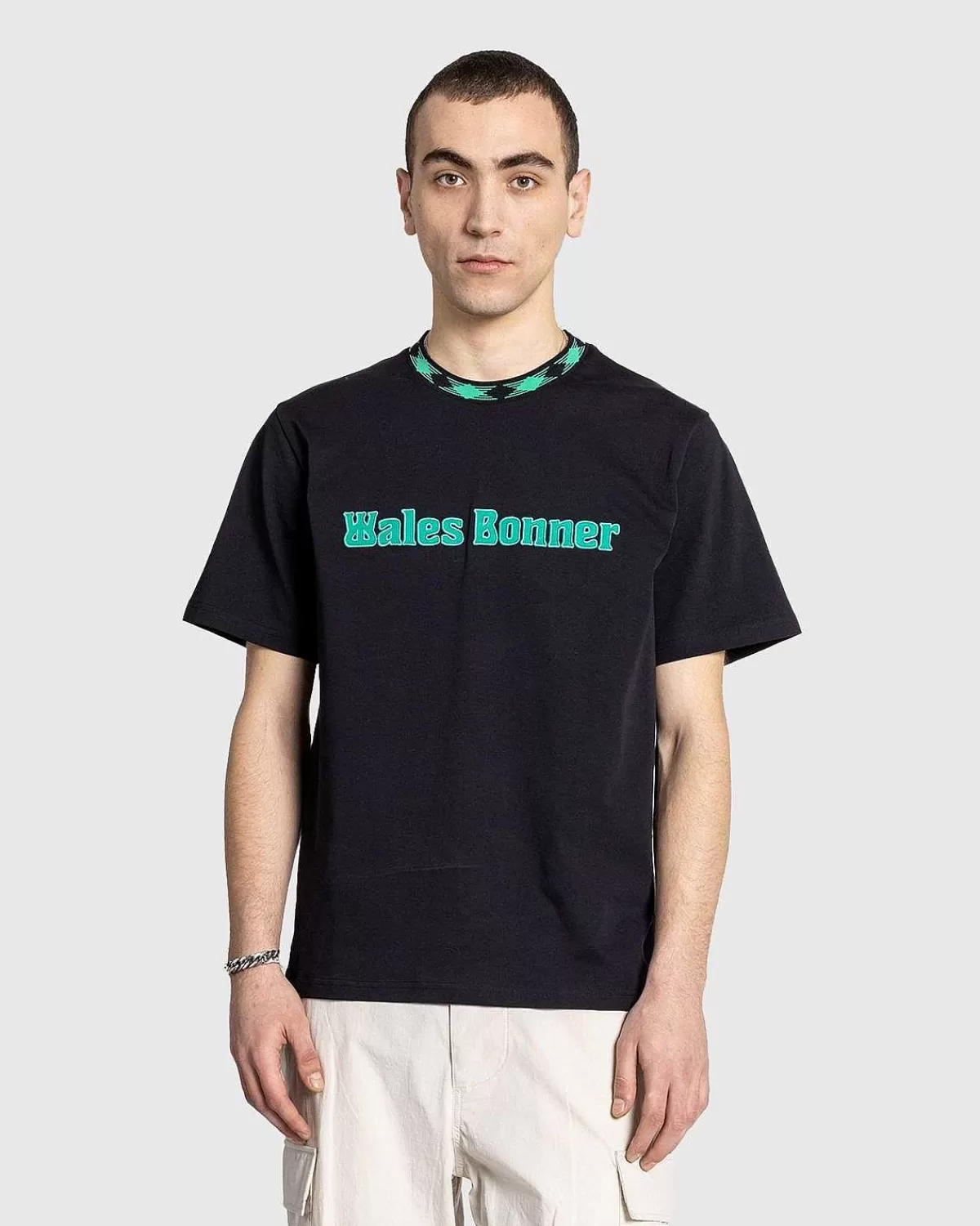 Denne Nye Version Af Den Originale T-Shirt Af Wales Bonner Er Udført I En Overvejende Sort Farve. Produceret I 100 % Økologisk Bomuld, Den Boxy, Kortærmede Stil Er Detaljeret Med En Mønstret Rund Hals Og Udsmykket Med Et Komplementært Wales Bonner-Logo Broderet Foran Og I Midten.