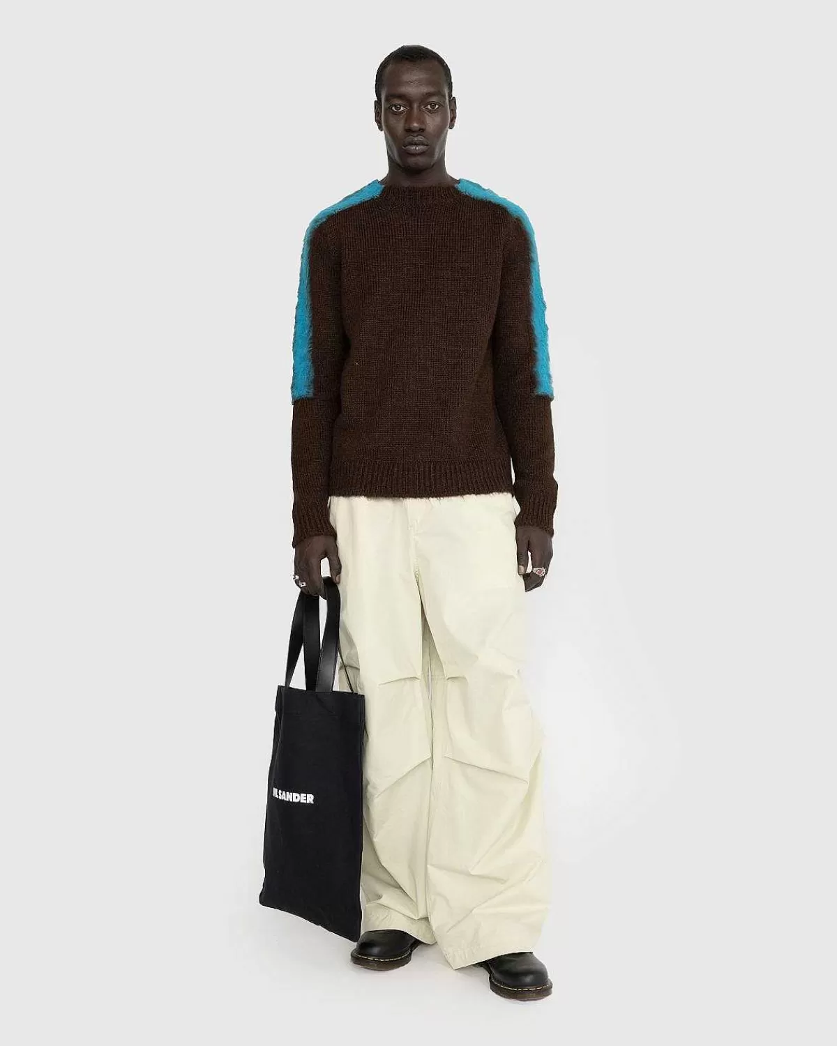 Et Slidstærkt Bomulds- Og Hørlærred Bruges Til Kroppen Af Jil Sander-Bogstasken, Da Håndtagene Er Det, Der Tiltrækker Opmærksomhed, Og De Kommer Frem I Plyslæder. Læder Er Også Brugt På Den Indvendige Lomme På Tasken, En Der Giver Dig Mulighed For Mere Bekvemt At Opbevare Mindre Genstande. Med Hensyn Til Branding Er Bogpakken Detaljeret Med Et Minimalt Logo, Etikettens Signatur, Front Og Center.
