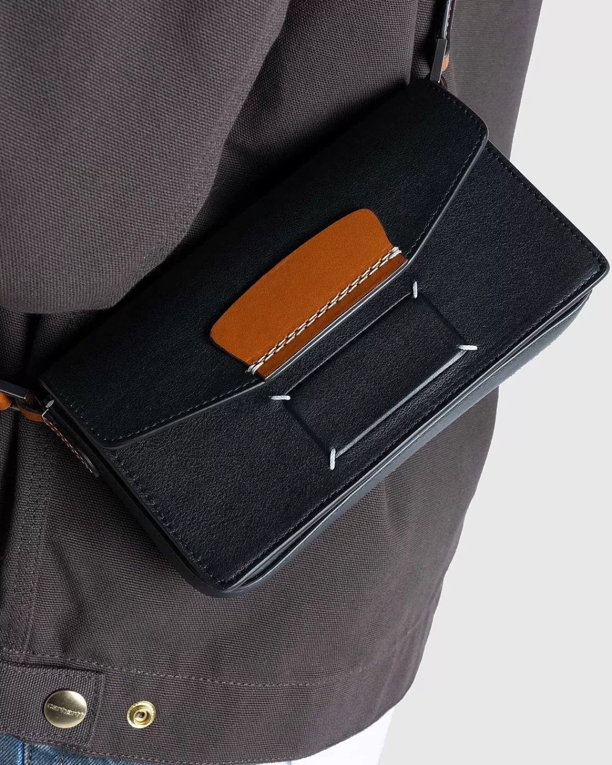 Dette Maison Margiela-Tilbehør Er Hovedsageligt Fremstillet Af Smidigt Kalveskind Med En Glat Kernefinish Og Er En Luksus, Hverdagsbagagestil, Der Kan Parres Med Både Afslappede Eller Mere Formelle Outfits. Det Fremviser Et Tofarvet Sort Og Karameldesign Med Husets Ikoniske Firesømmemoniker På Ydersiden. Tasken Har En Justerbar Skulderrem, En Fold-Over-Top Med Magnetisk Lukning Og En Indvendig Glidelomme For Optimal Organisering.