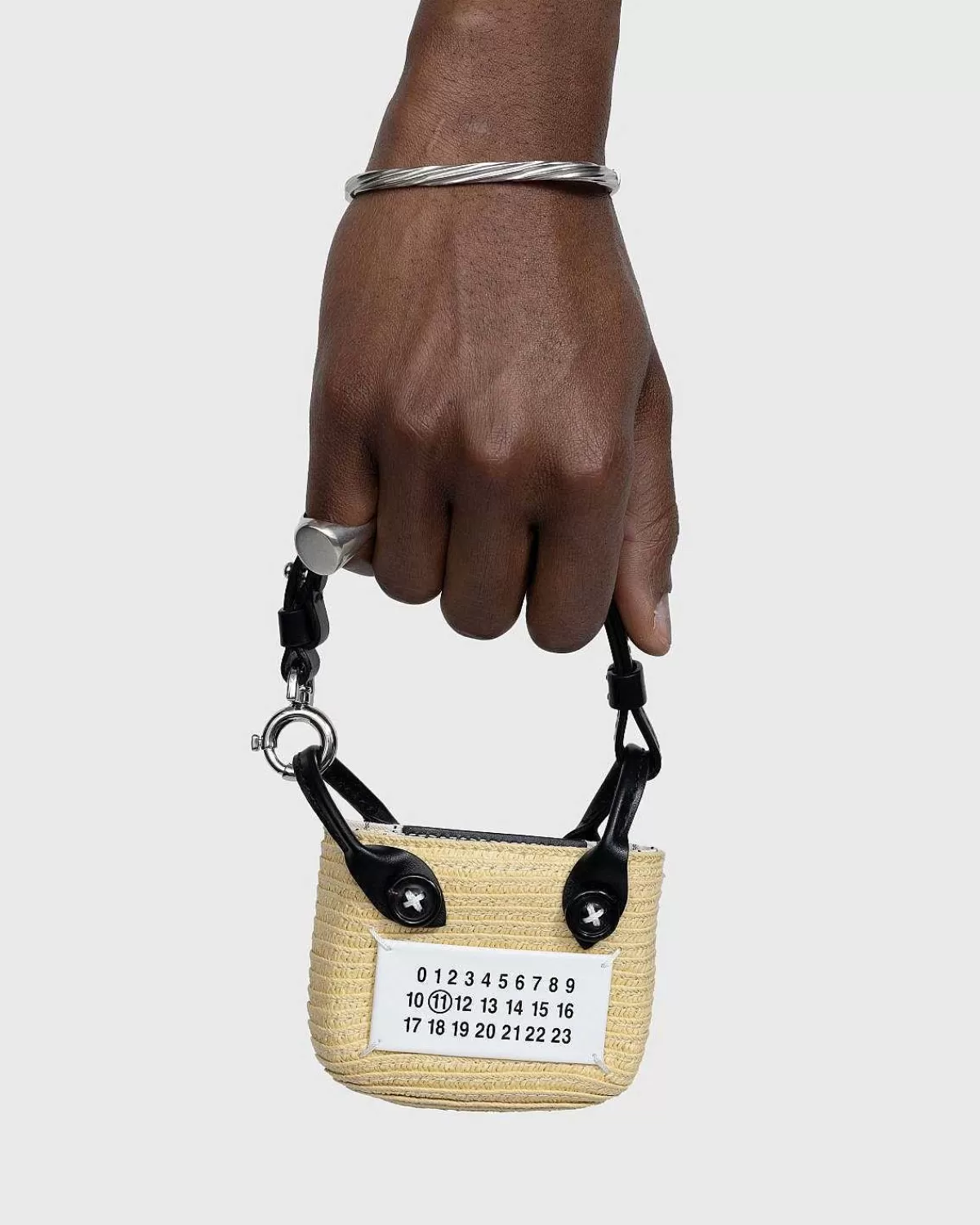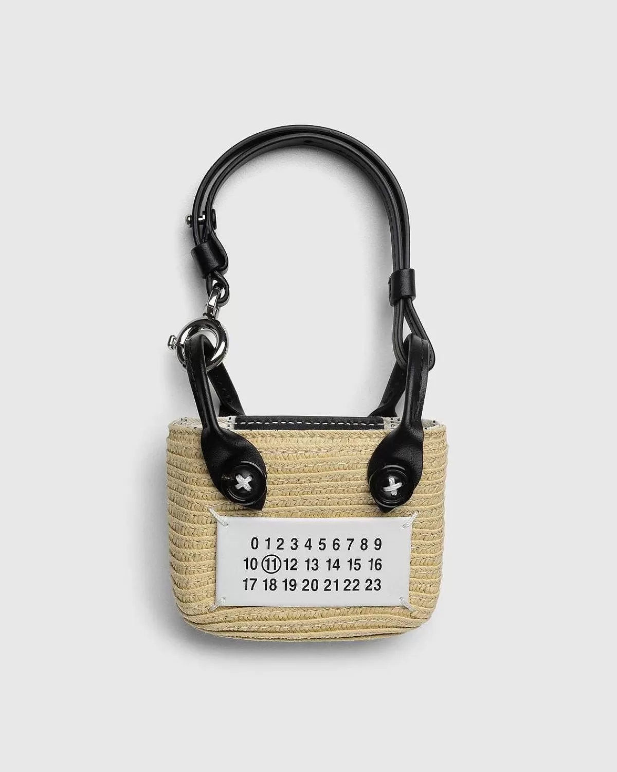 Denne Kompakte Margiela-Bagagestil Er Lavet Af En Blanding Af Raffia- Og Polyestermaterialer. Den Har Sølvfarvet Metalhardware Og Rullede Læderhåndtag Med Et Åbent Hovedrum. Husets Numeriske Logo Mærker Designet På Forsiden, Som Signatur Margiela-Stingmærker Er Så Inkorporeret I Hele Silhuetten.