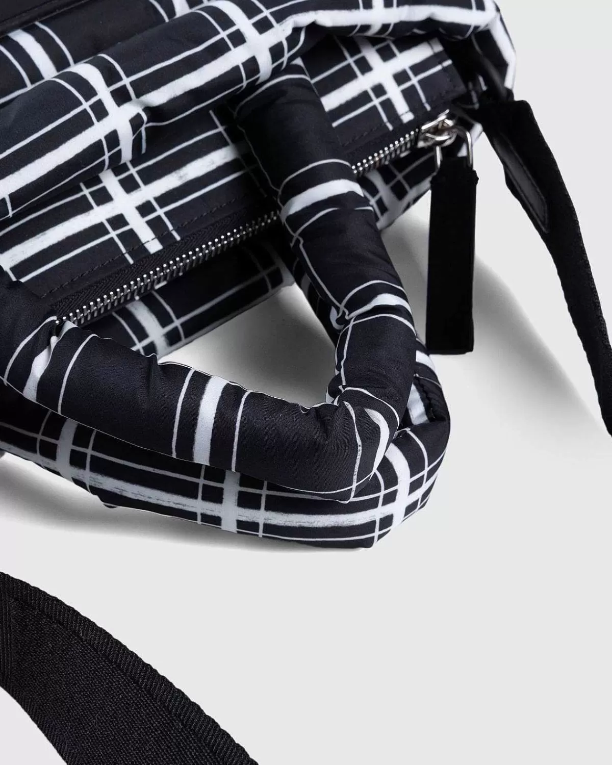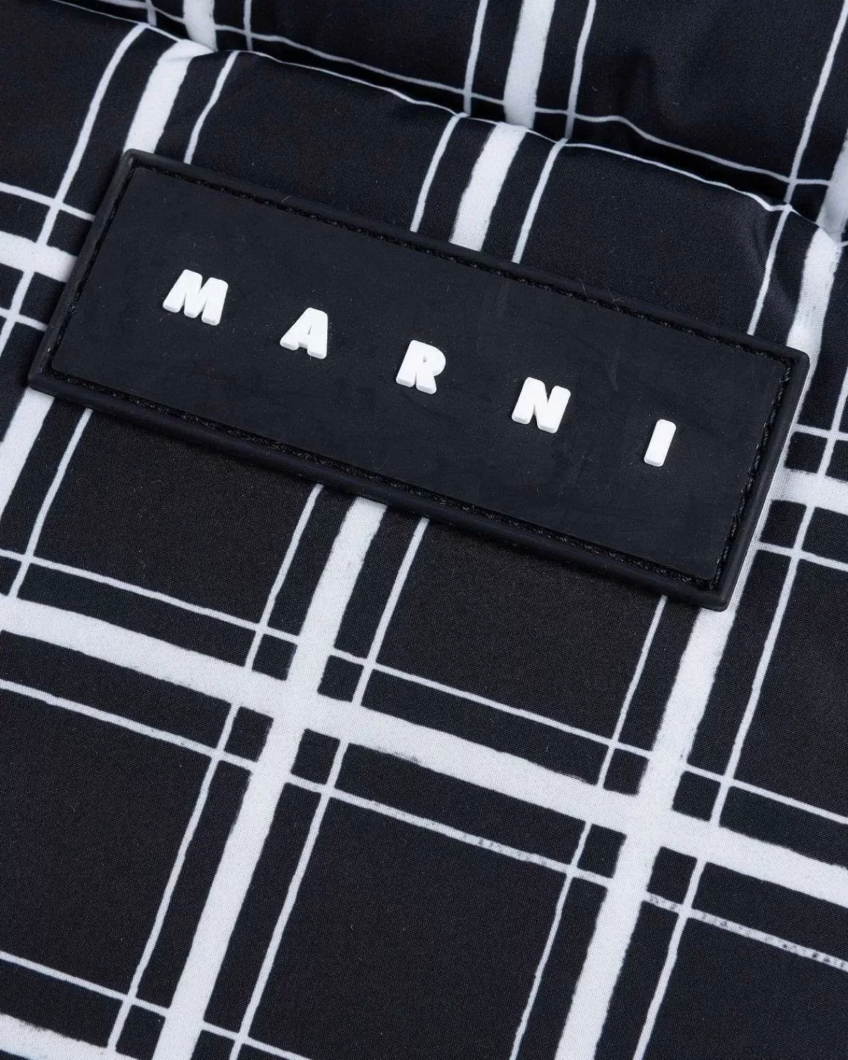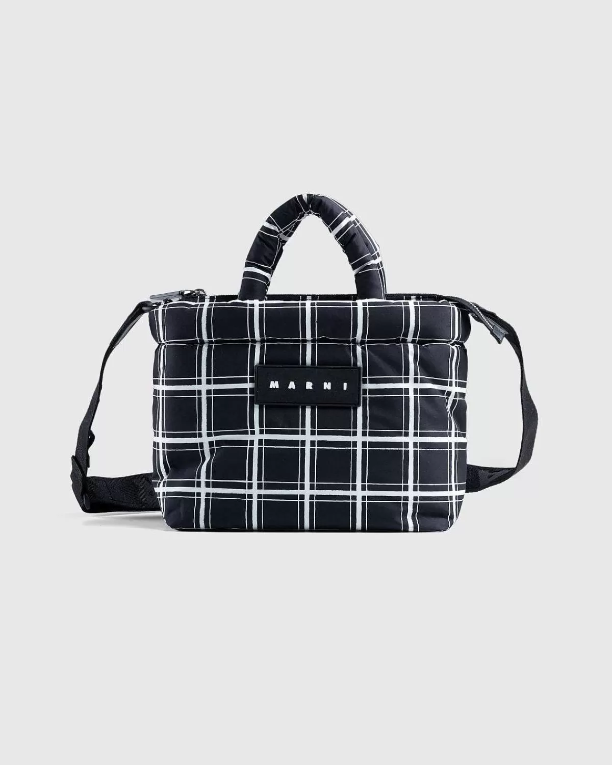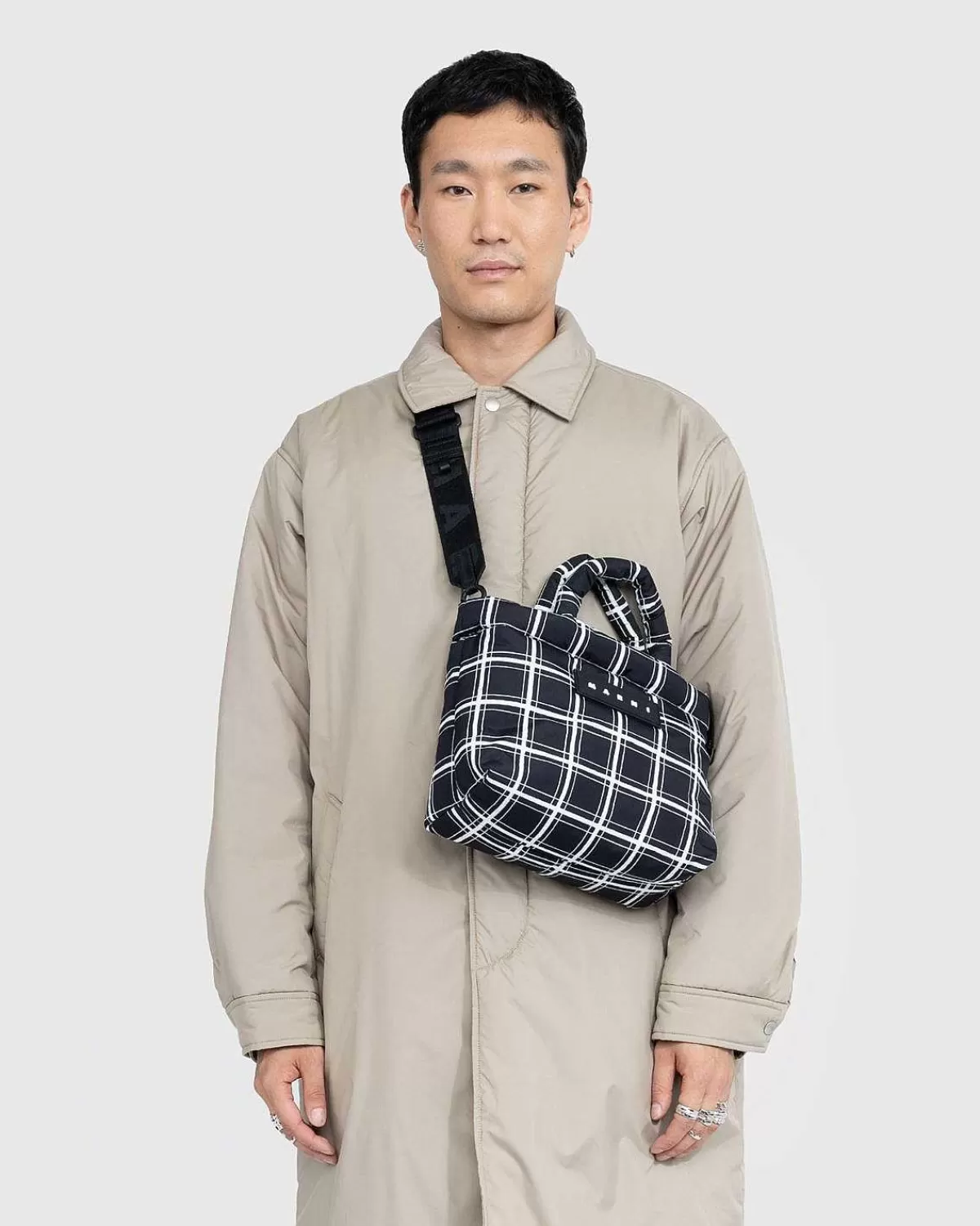 Marnis Mini Plaid Ternet Mulepose Er Defineret Af Dens All-Over Mønster. Det Funktionelle Tilbehør Kommer I En Alsidig Sort Og Hvid Farvevariant Og Er Lavet Af En Kombination Af Polyester, Polyurethan, Kalvelæder Og Nylonmaterialer. Den Har Cirkulære Tophåndtag Samt En Logo-Præget Skulderrem, Der Er Justerbar Og Aftagelig, For At Give Mulighed For Forskellige Stylingmuligheder. Et Marni-Logoemblem Er Påført Ansigtet For Definitivt At Mærke Stilen.