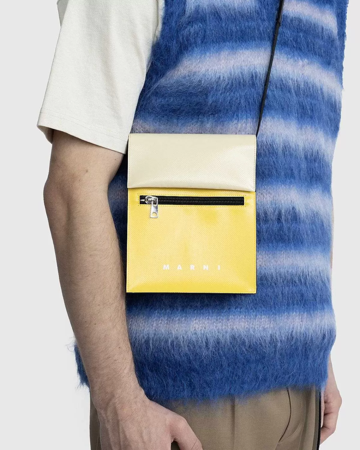Marnis Signatur Tribeca-Design Vises Denne Sæson Ved Hjælp Af En Mere Kompakt Skuldertaske. Hverdagsstilen Er Lavet Af Polyester Med Palladiumdele, Med En Topklap Med Trykknap, En Aftagelig Og Justerbar Nylonstrop Og En Frontlomme Med Lynlås Samt En Baglomme. For At Mærke Silhuetten Har Marni Et Lille Kontrasterende Logo På Forsiden.