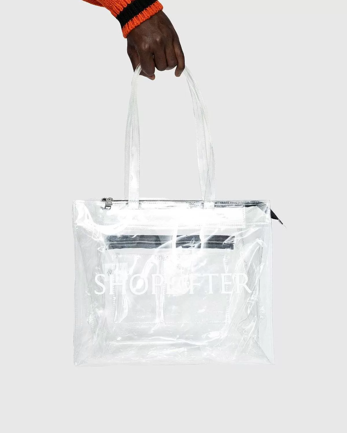 Et Legende Bud På Den Klassiske Mulepose, Den Gennemsigtige Butikstyv Fra Thames Er Lavet Med Et Gennemsigtigt Polyurethan-Ydre Og 100 % Polyesterfor. Den Har Lynlåslukning Med Indvendige Rum Til Organisering, Samt Dobbelte Bærehåndtag Til Hånd- Eller Skulderbæremuligheder. Et Trykt Logo Er Påført Silhuettens Ansigt For At Frækt Mærke Designet.