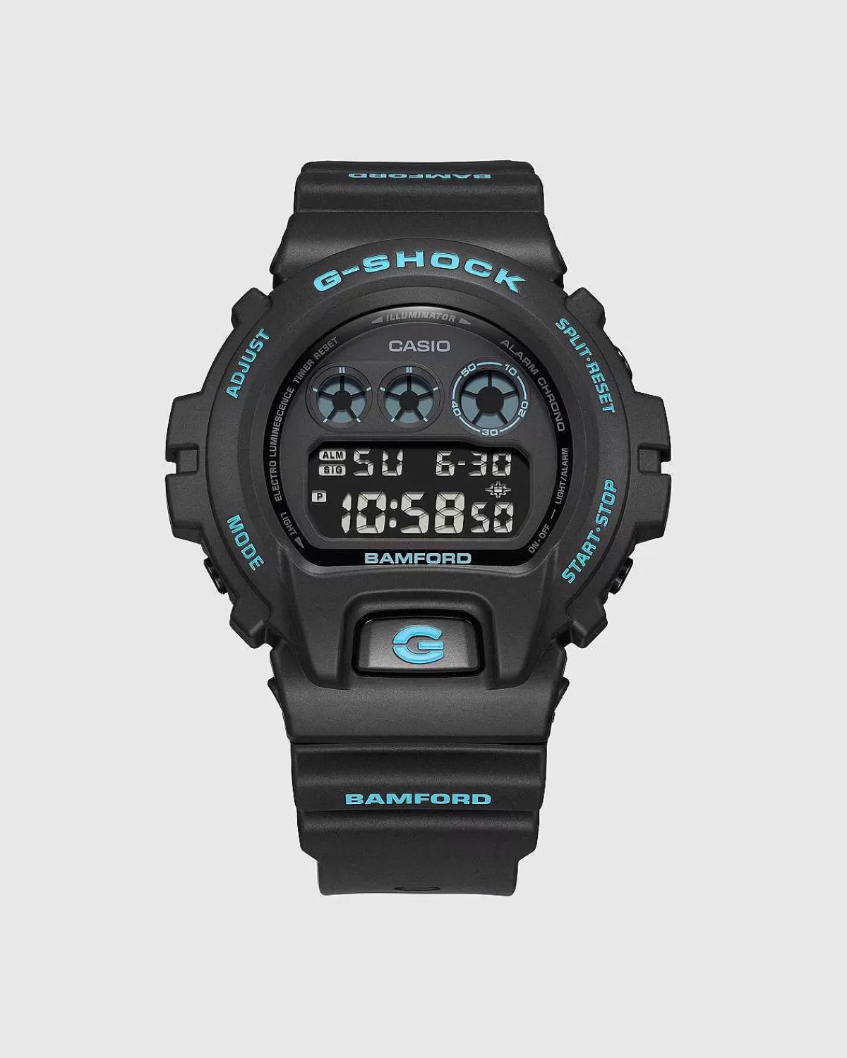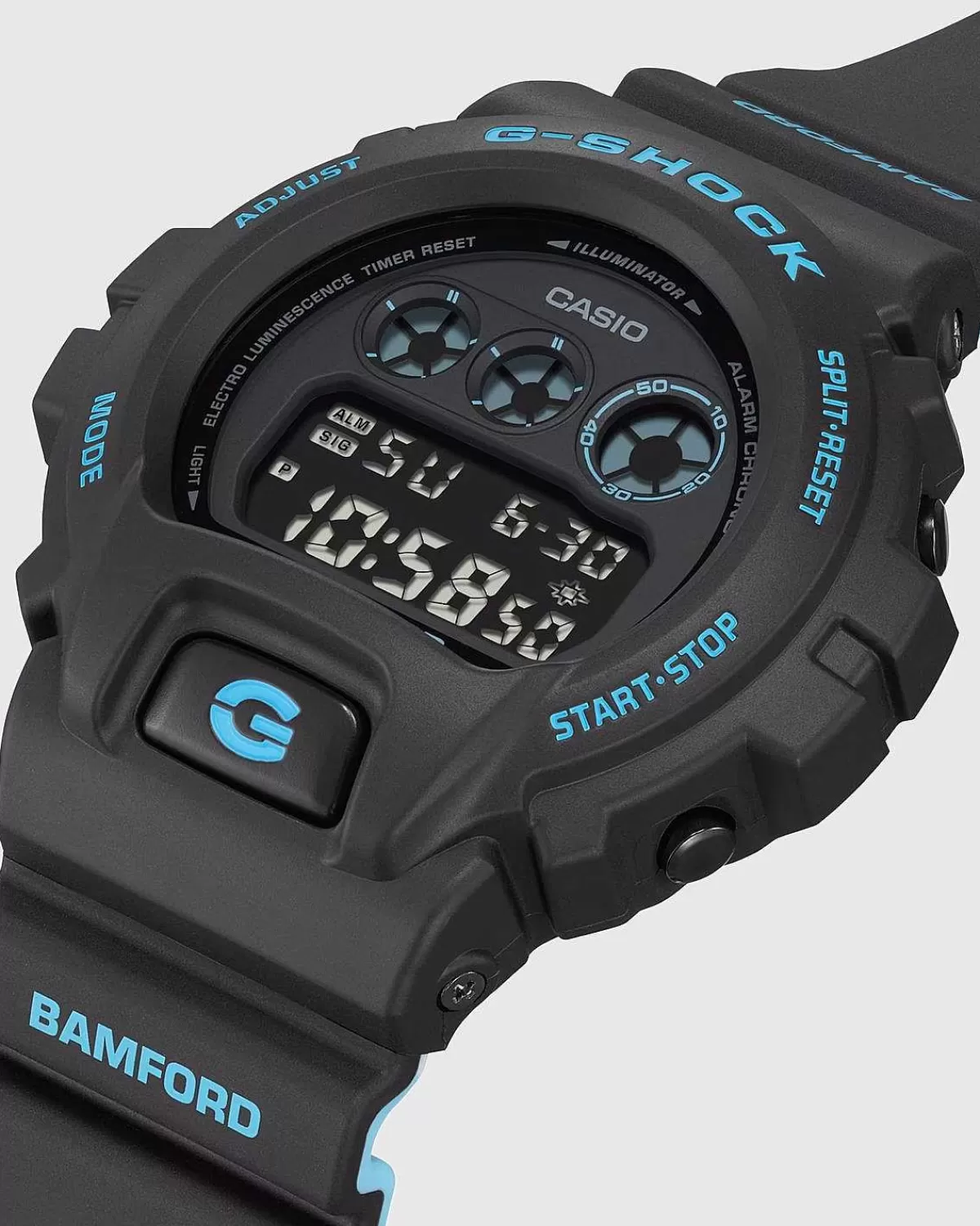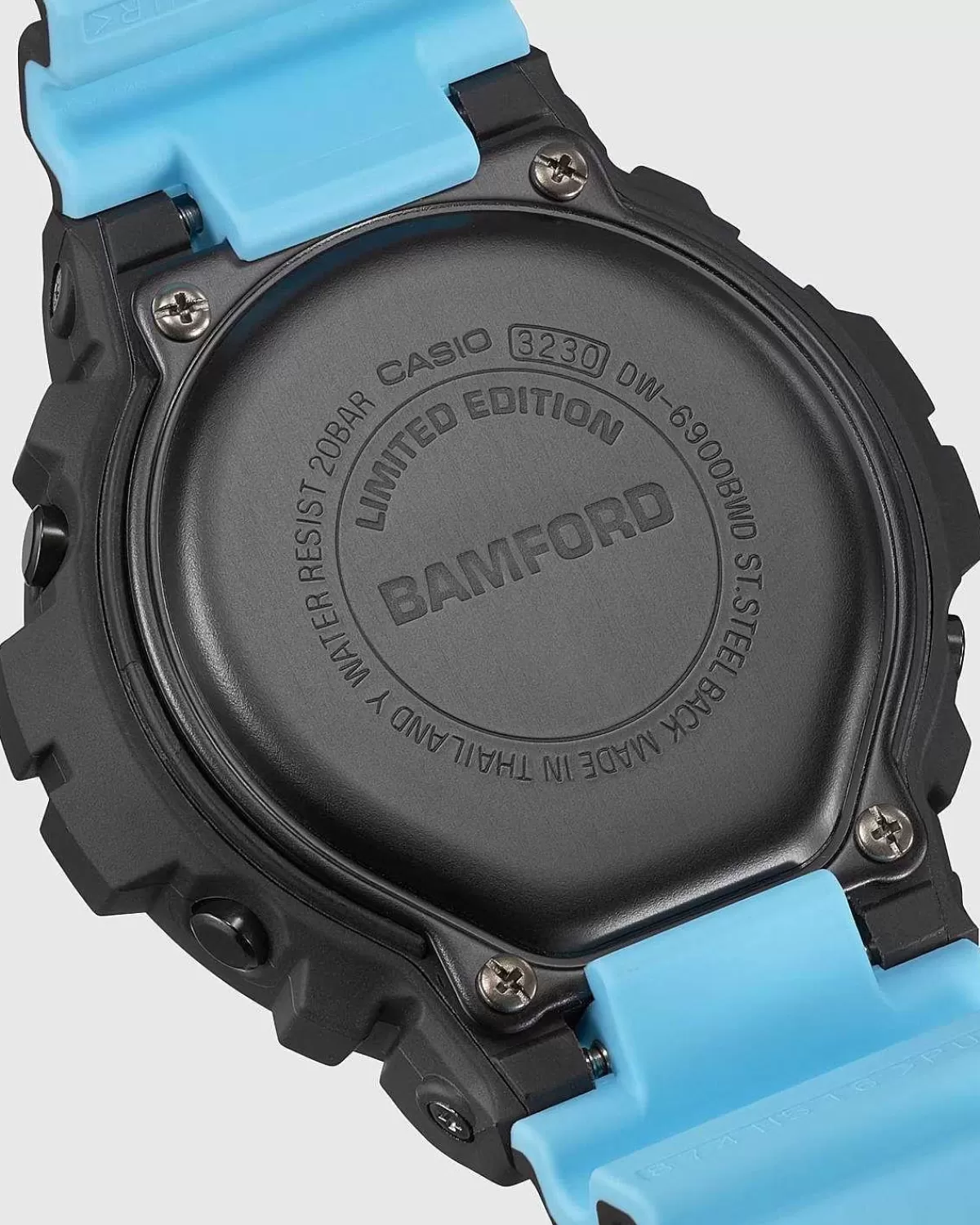 Denne Limited Edition-Version Af Dw6900 Er Lavet I Samarbejde Med Bamford Watch Department. Det Britiske Urfirmas Signatur Lyseblå Nuance Giver Urskiven En Farve, Parret Med Et Tofarvet Bånd For Et Elegant Look. Designet Er Baseret På Den Karakteristiske Tredobbelte Graf Og Frontknap På Dw6900, Da Tilpasset Branding Derefter Implementeres For At Signalere Den Fælles Udgivelse. Også Kendt For Sine Tekniske Specifikationer, Har G-Shock Udstyret Dw6900 Med En Baggrundsbelysning Til Synlighed I Svagt Lys Situationer, Timer Og Stopfunktion For Atleter, Multifunktionel Alarm Og Automatisk Kalender, Blandt Andre Funktioner.