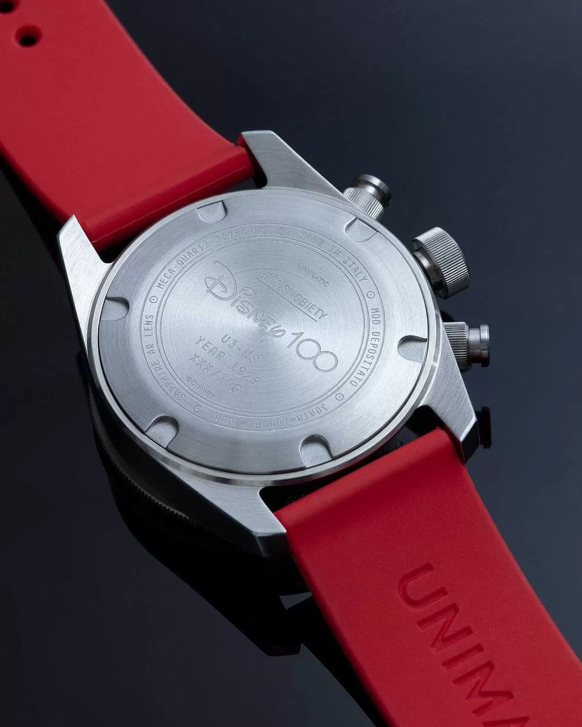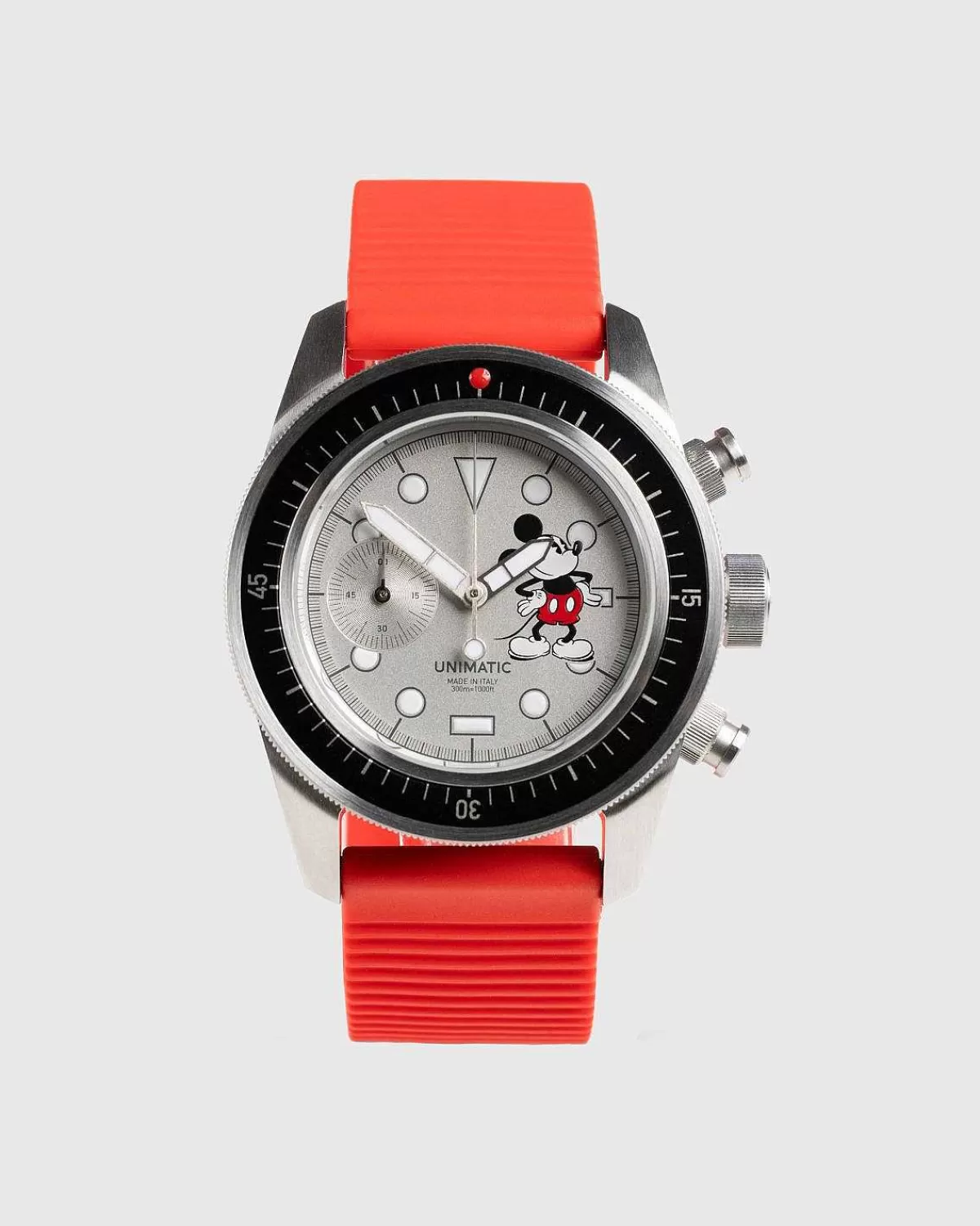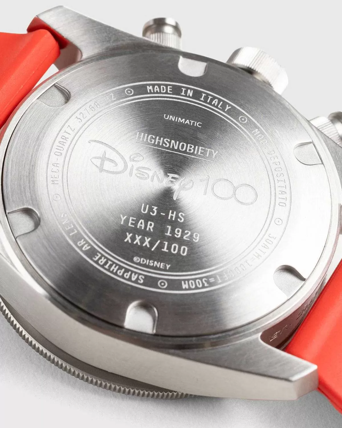 Denne Eksklusive Chrono Diver Fra Vores Unimatic X Disney X Highsnobiety-Samarbejde Fejrer 100 Års Disney. Uret I Begrænset Udgave Er Lavet I Italien Og Leveres Individuelt Nummereret Med Kun 100 Lavet. Dens Cool Grå Urskive Viser Mickey Mouse-Illustrationen Fra 1929, Indkapslet I En Robust 40 Mm Rustfri Stålskal. Bagsiden Af Etuiet Er Specialindgraveret Med Disney100-Logoet Og Året For Mickey’S Ikoniske Tegning. Modello Tre U3-Hs Er Ikke Bare En Hyldest Til Disneys Arv, Men Også Gennem Unimatics Designsprog En Reference Til Urets Mest Ikoniske Ure. Hvert Ur Præsenteres I Skræddersyet 100-Års Jubilæumsemballage – En Sand Samlerperle.